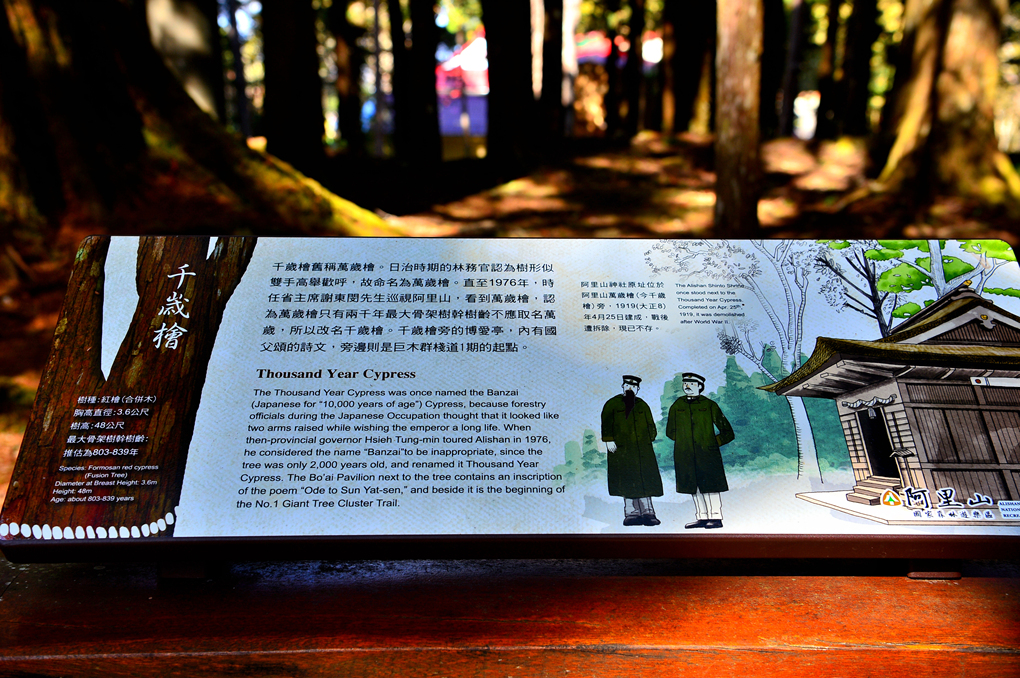 1976년 당시 지사인 셰퉁민이 아리산을 여행했을 때 수령이 겨우 2,000년 밖에 안 되었기 때문에 '반자이'라는 이름이 부적