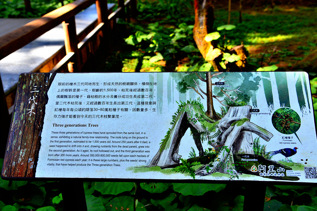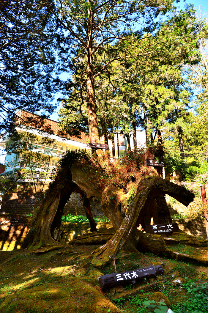 3대에 걸친 이 편백나무는 같은 뿌리에서 싹을 틔웠고 자연스러운 가계도를 보여 주는데, 땅에 누워있는 뿌리는 1세대로
