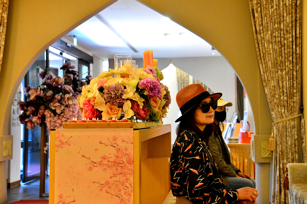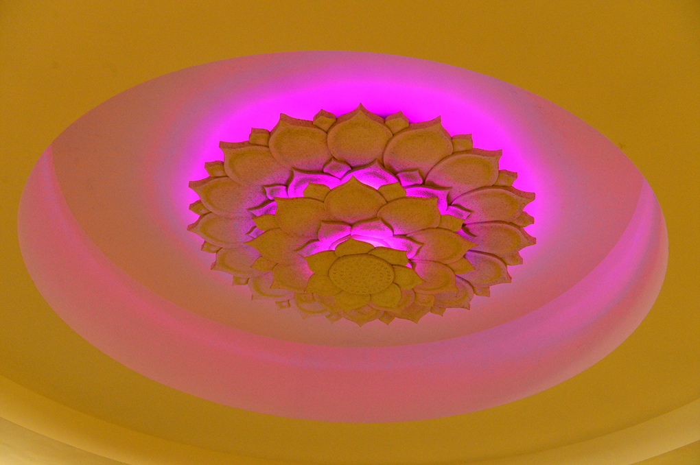 천장은 화사한 연꽃 모양의 등으로 장식되어 있다.