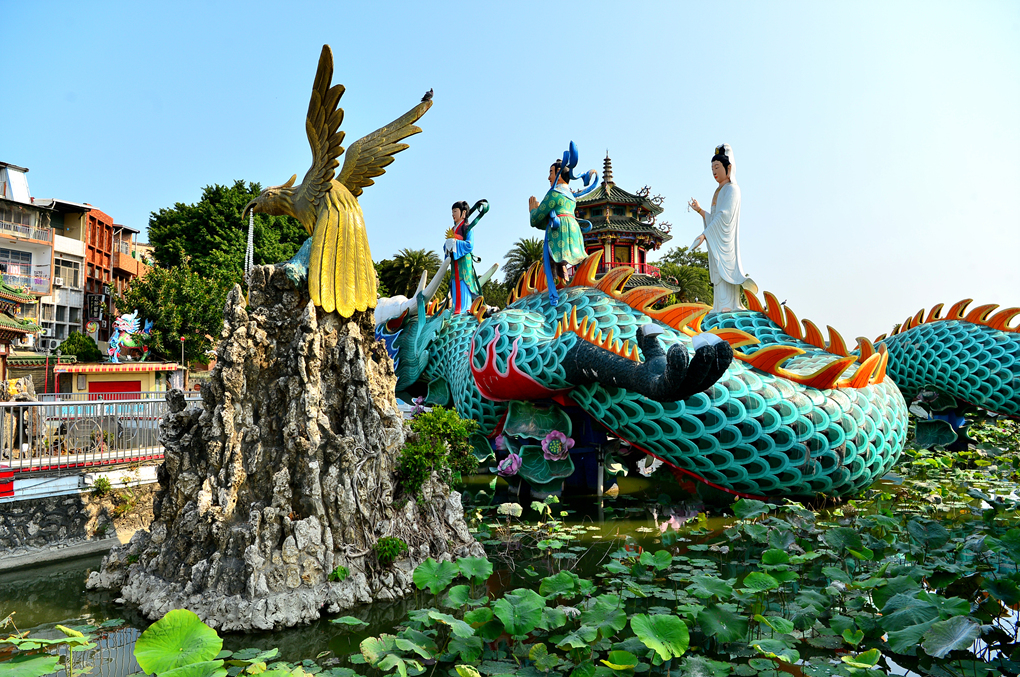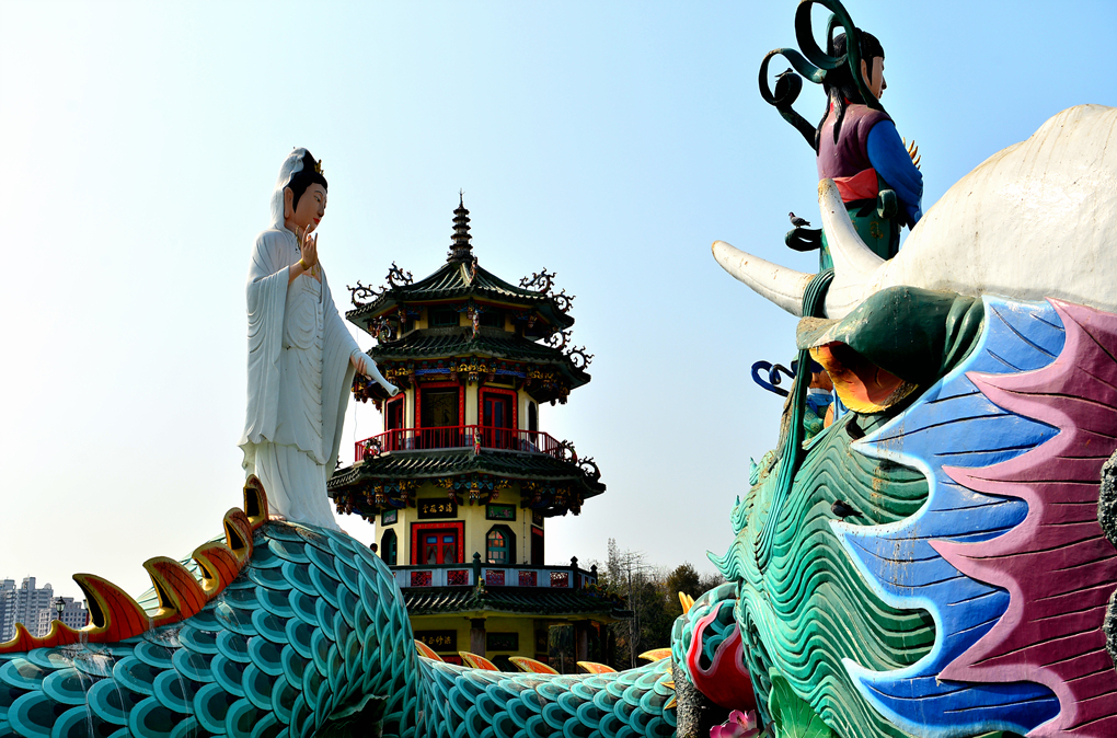 도교 사원 맞은편 연지담에는 사원을 향해 서있는 다양한 조형물들이 세워져 있다.