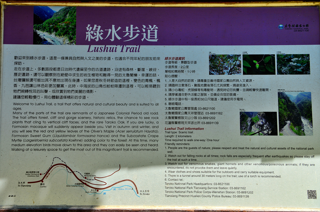 이 트레일에서는 숲, 절벽, 협곡의 풍경, 역사적 유물, 수직 절벽면에 달라붙은 바위 식물, 희귀한 Taroko Oak를 볼 수