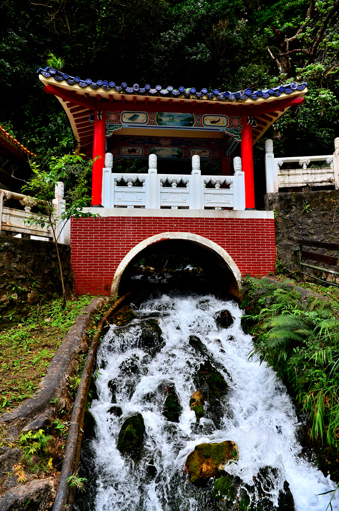장춘사의 사원 건물과 정자 사이에 위치한 폭포 위에는 누각을 지어 놓았다.