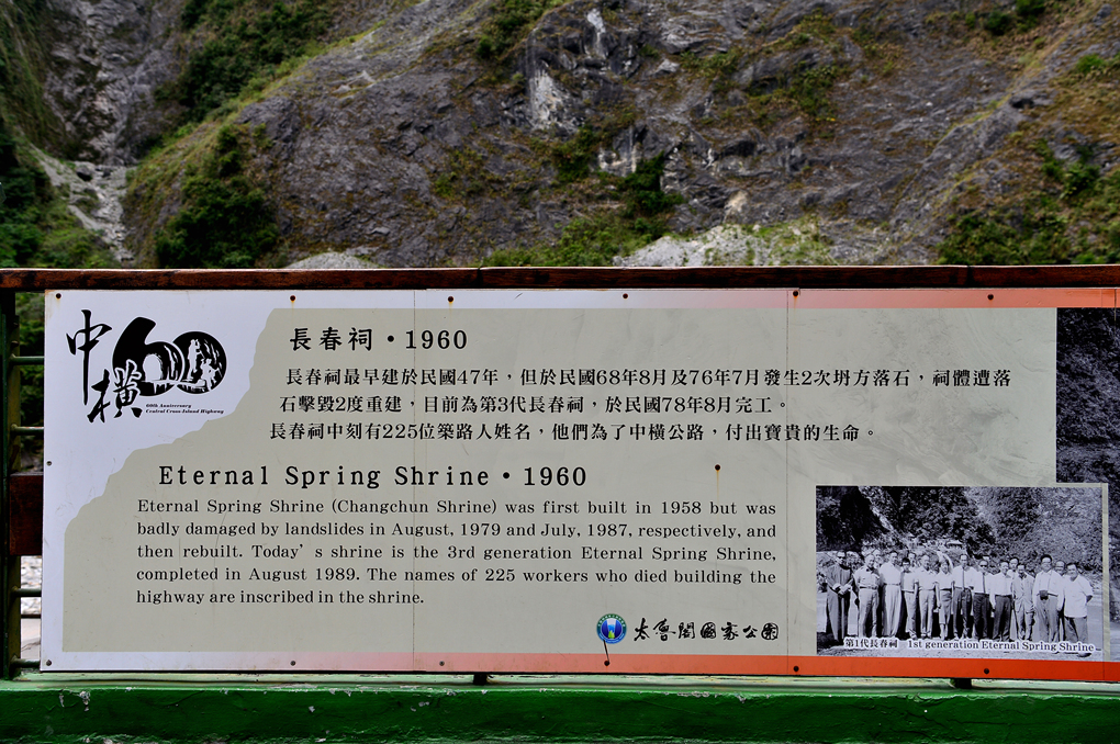 장춘사는 타이루거의 주요 도로인 중횡 도로 中橫公路를 건설하는 과정에서 죽은 225명의 영혼을 위로하고자