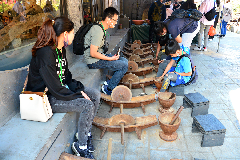 배 모양의 발을 이용한 절구와 손 절구로 암석을 파쇄하고 금을 채취하는 과정을 체험해 보는 중이다.