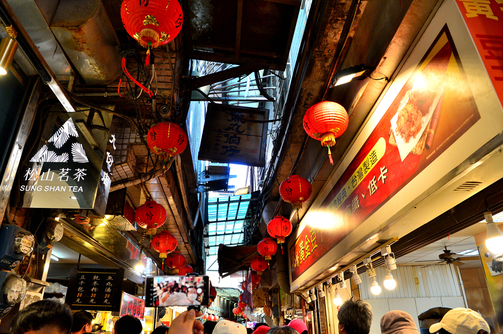 계속 이어지는 처마 부분의 홍등과 그 아래의 상점들~
