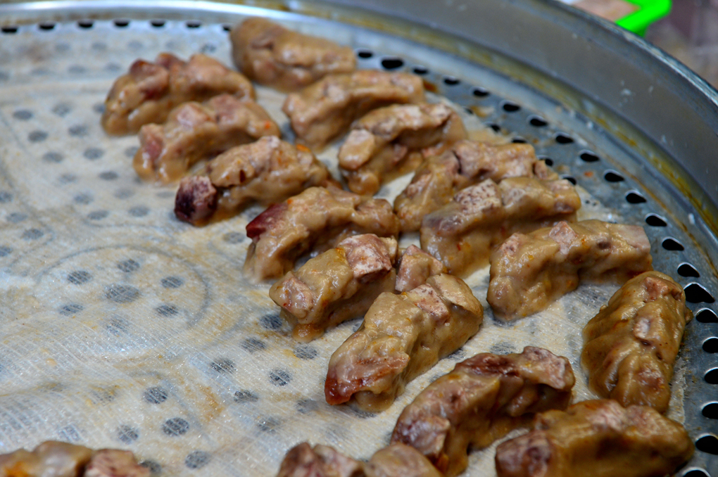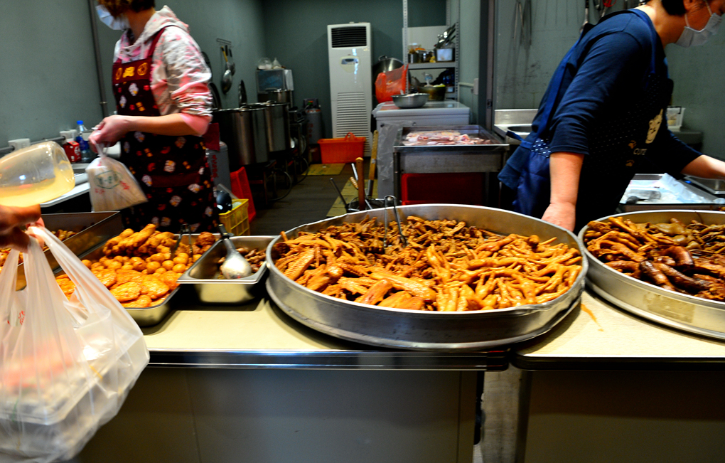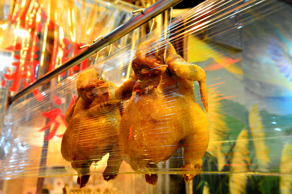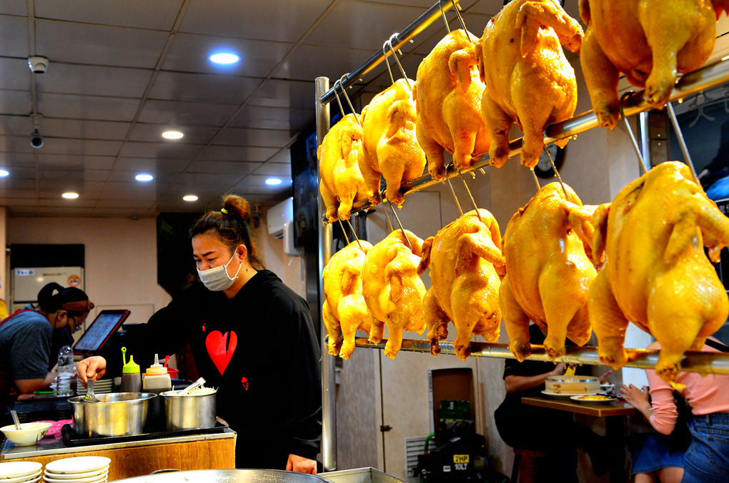 줄줄이 매달아 놓은 통닭 옆에는 시식할 수 있는 공간도 마련되어 있었다.