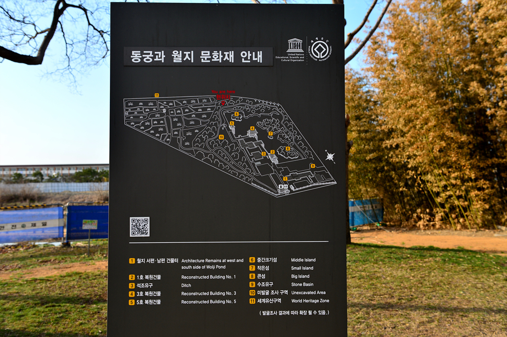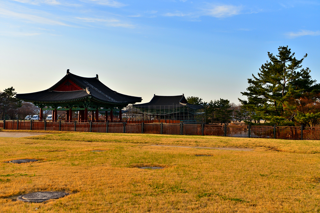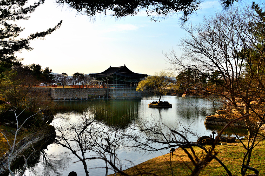 그런데 소나무 섬 너머의 동궁 주변은 온통 비계 투성이가 아닌가~