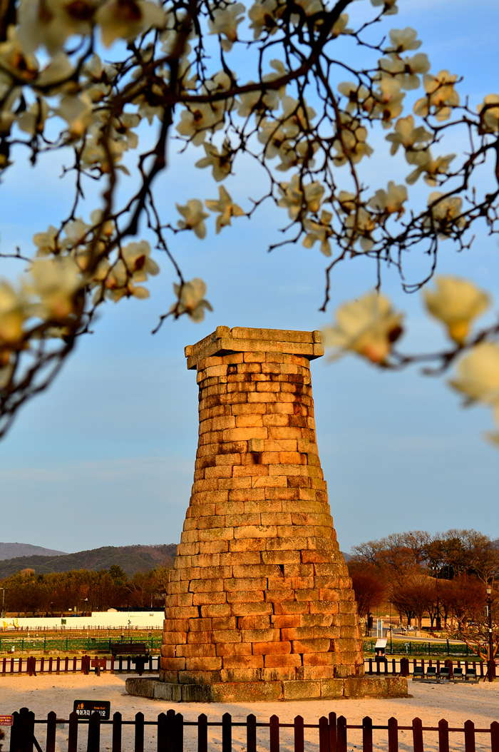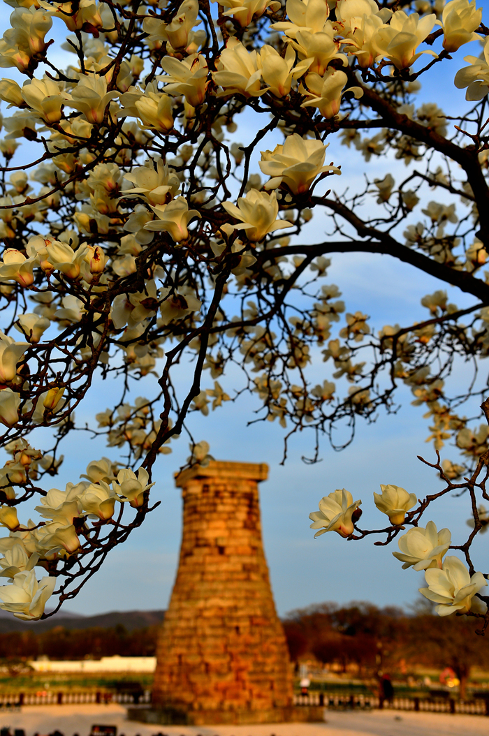 목련과 어우러진 첨성대의 아름다운 모습이다.