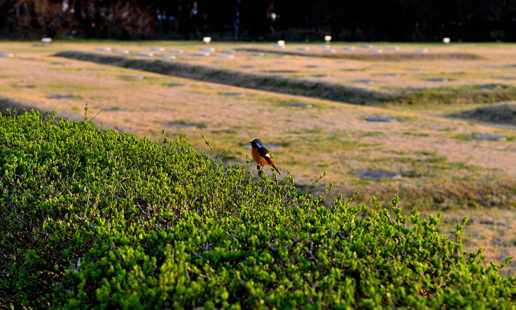 푸른 새싹 위에 앉아 있는 앙증맞은 작은 새가 귀엽다.
