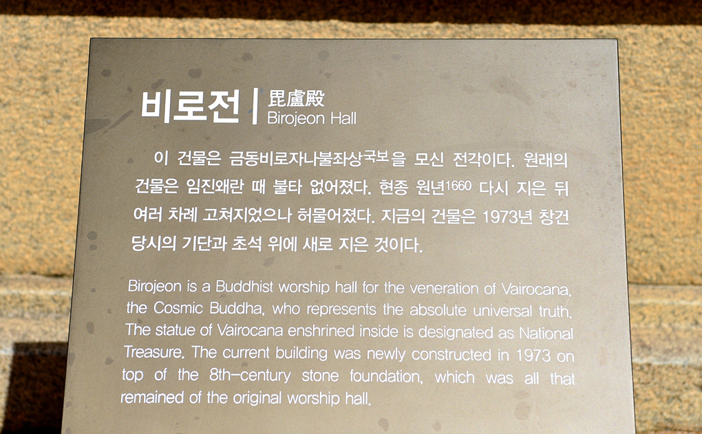국보 금동비로자나불좌상을 모신 비로전이다.