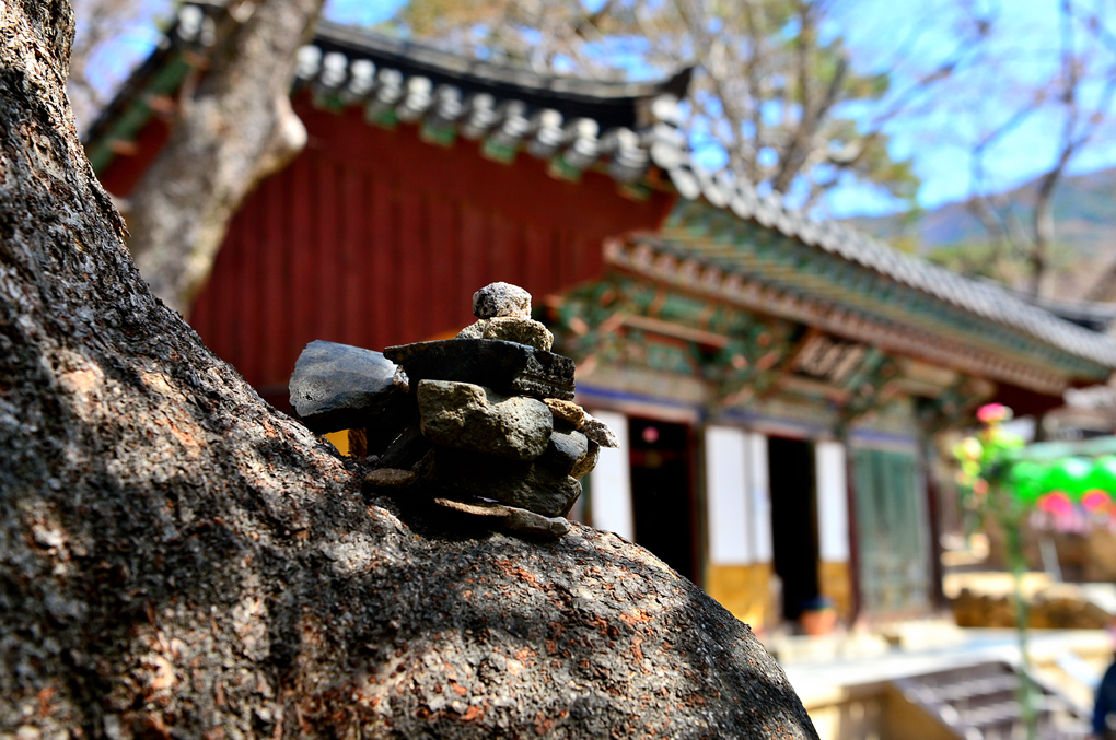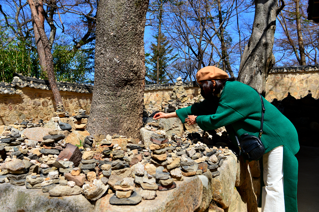 나무 등걸 위에도 담장의 기와 위에도 불자들의 소원을 담은 수많은 앙증맞은 탑들이 올라 있다.
