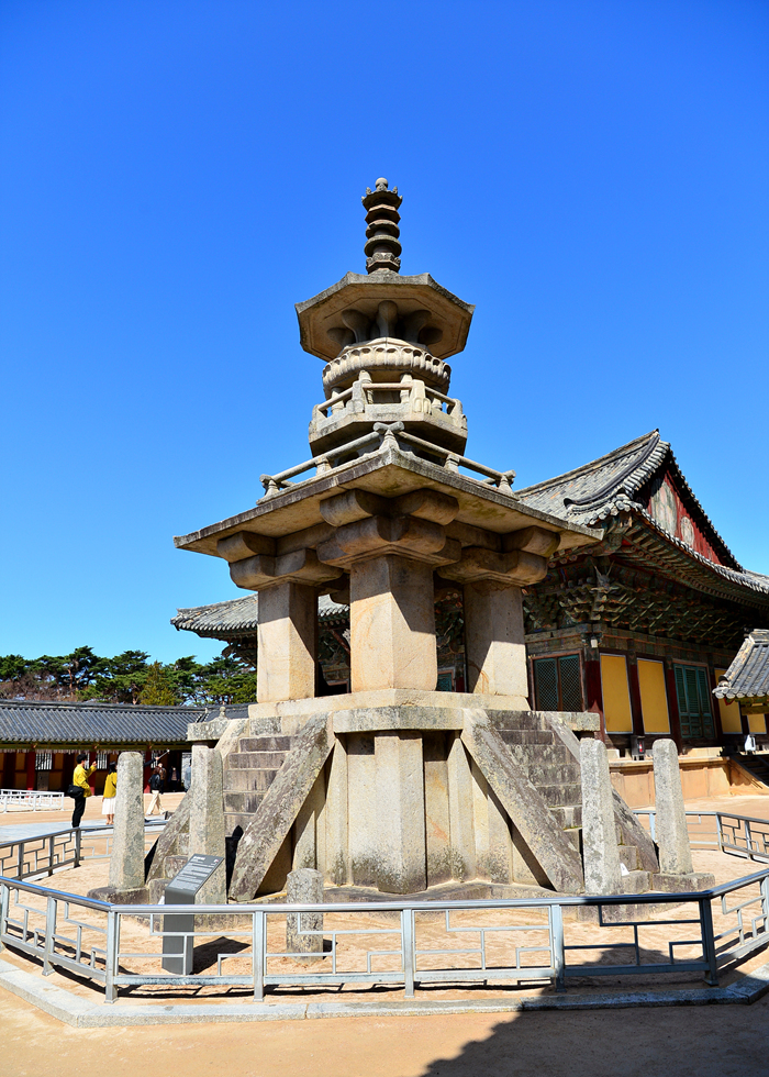 불국사 사리탑과 전각 모습이다.