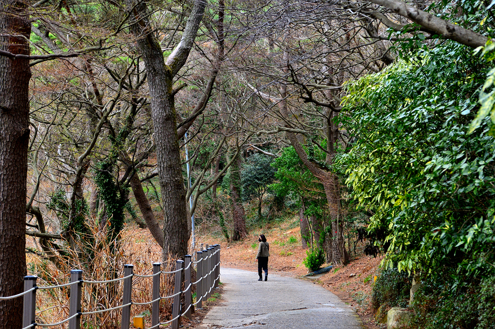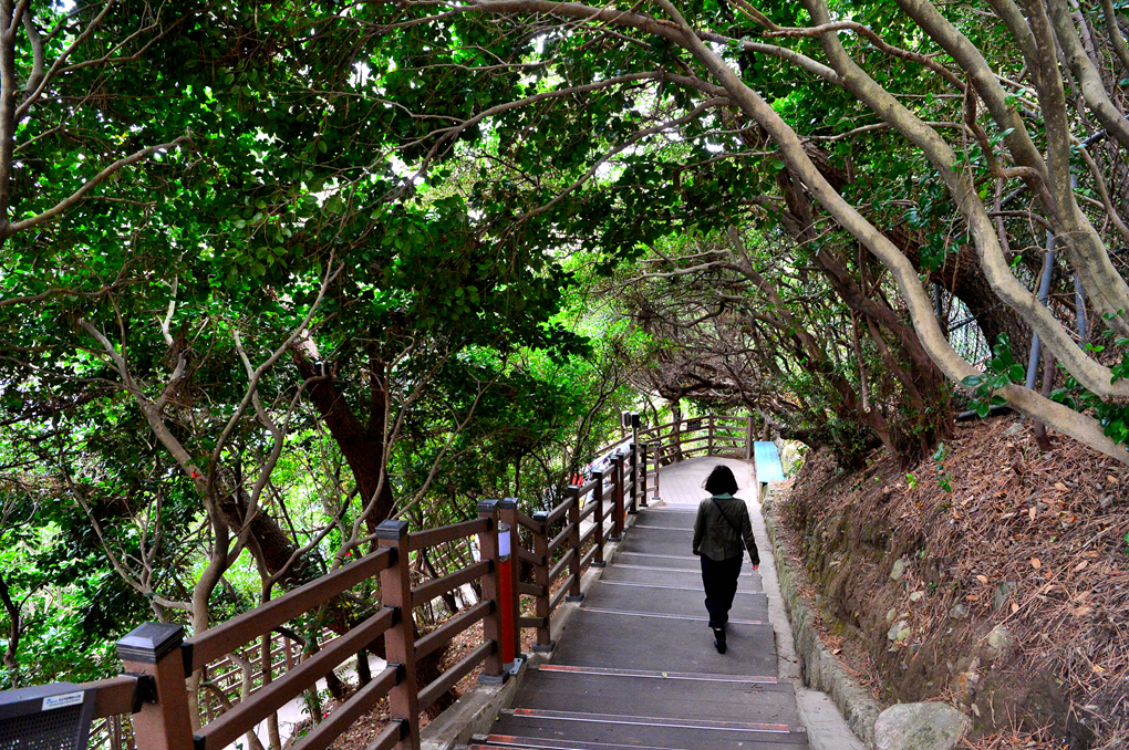 영도 등대로 내려가는 계단과 주변의 울창한 숲 풍경이다.
