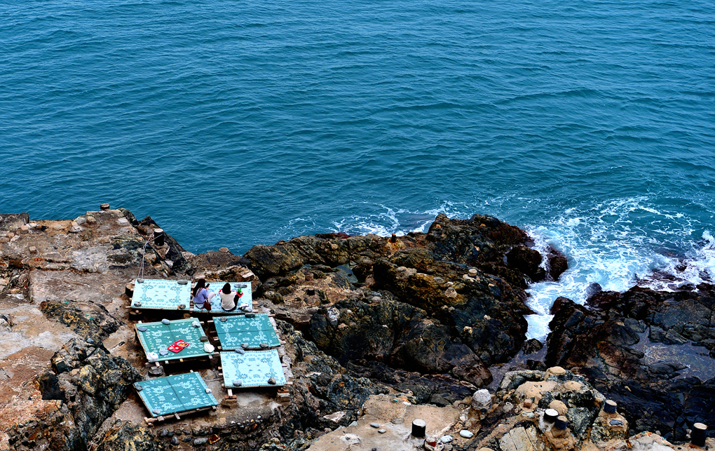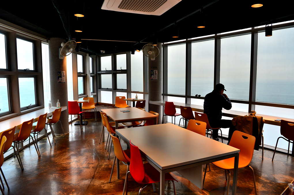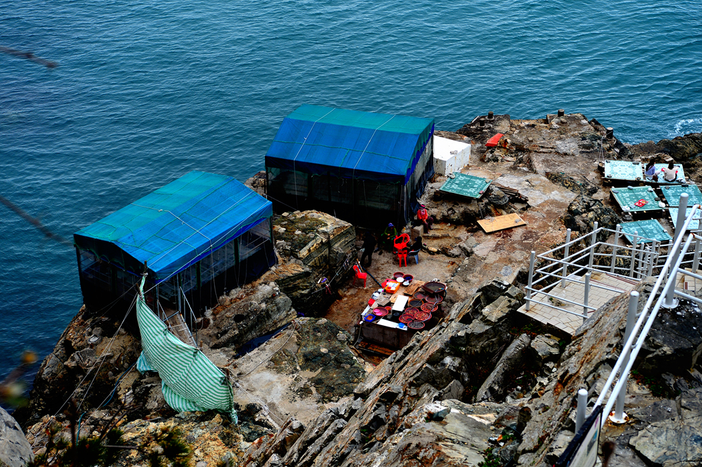 횟집의 좌대에는 푸른 바다를 바라보며 망중한에 빠져 있는 두 처자의 모습이 있다.