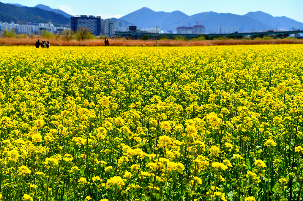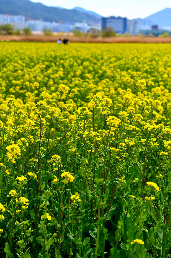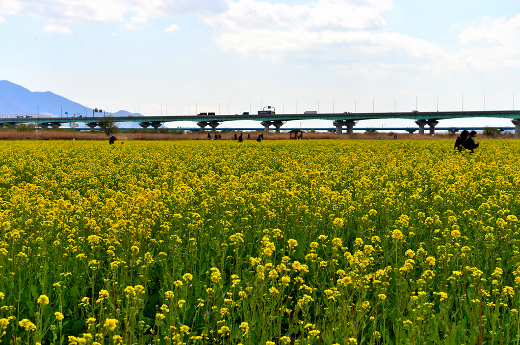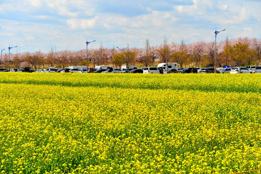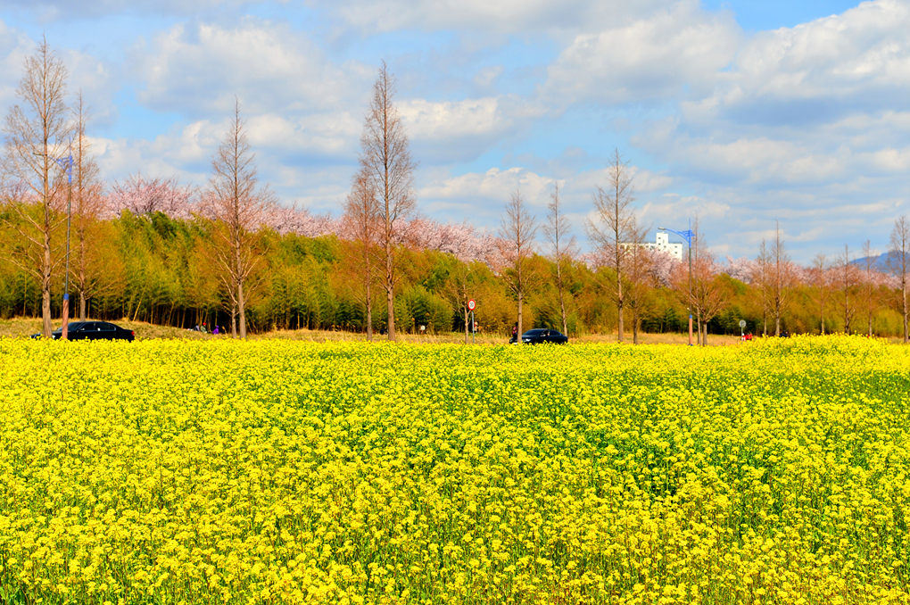 유채꽃밭 너머의 뚝방길에는 벚꽃이 피어 있나 보다.