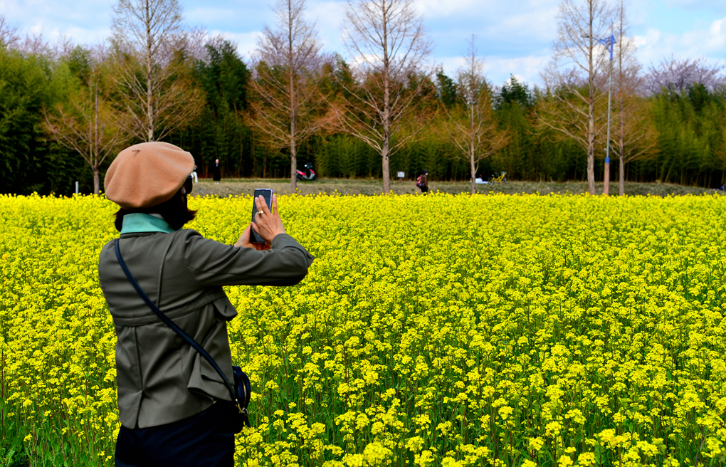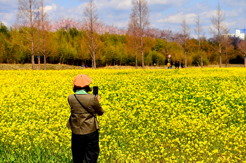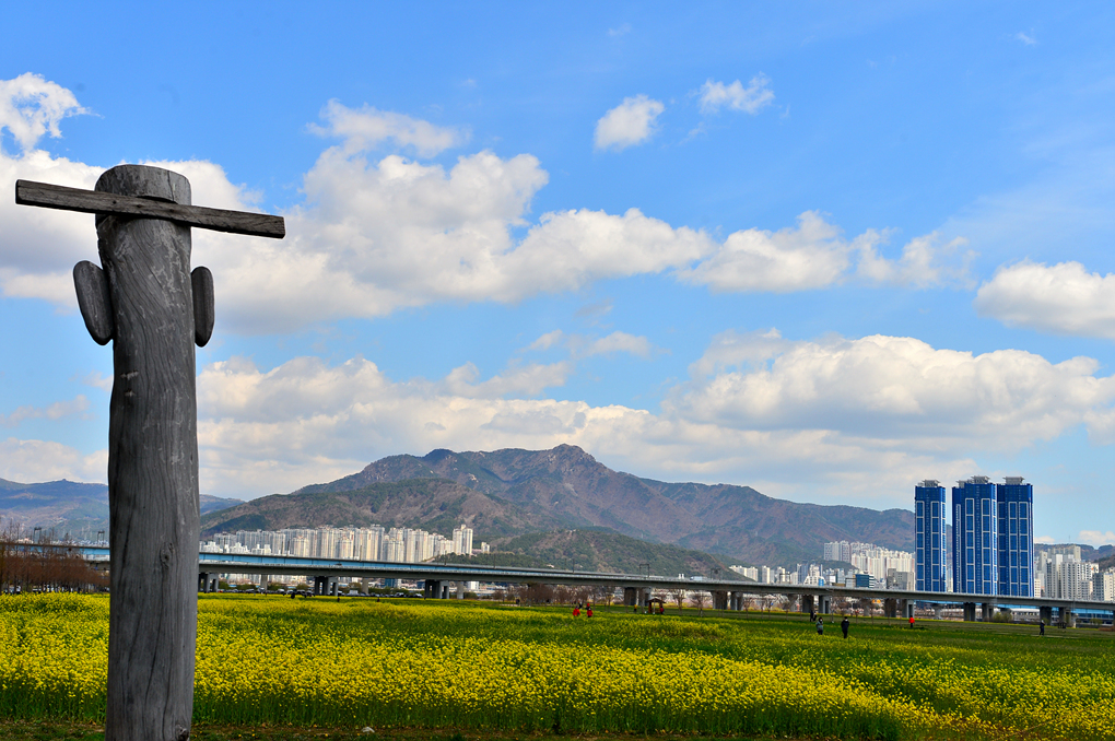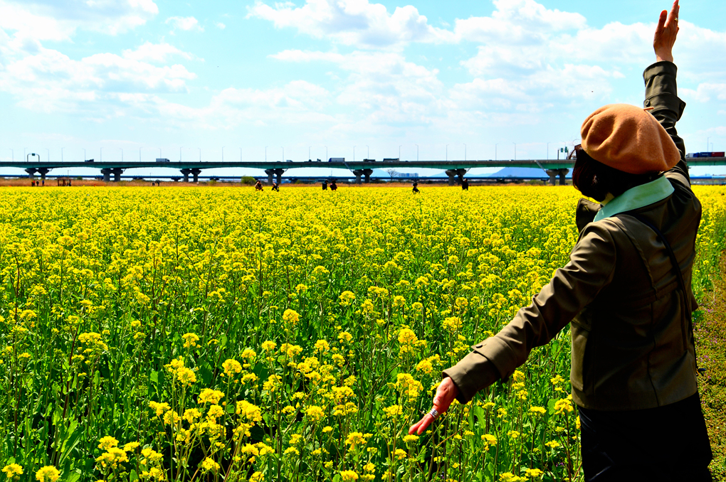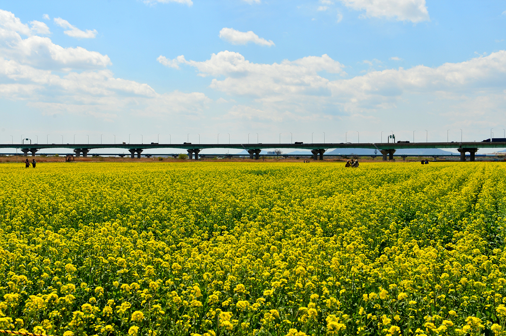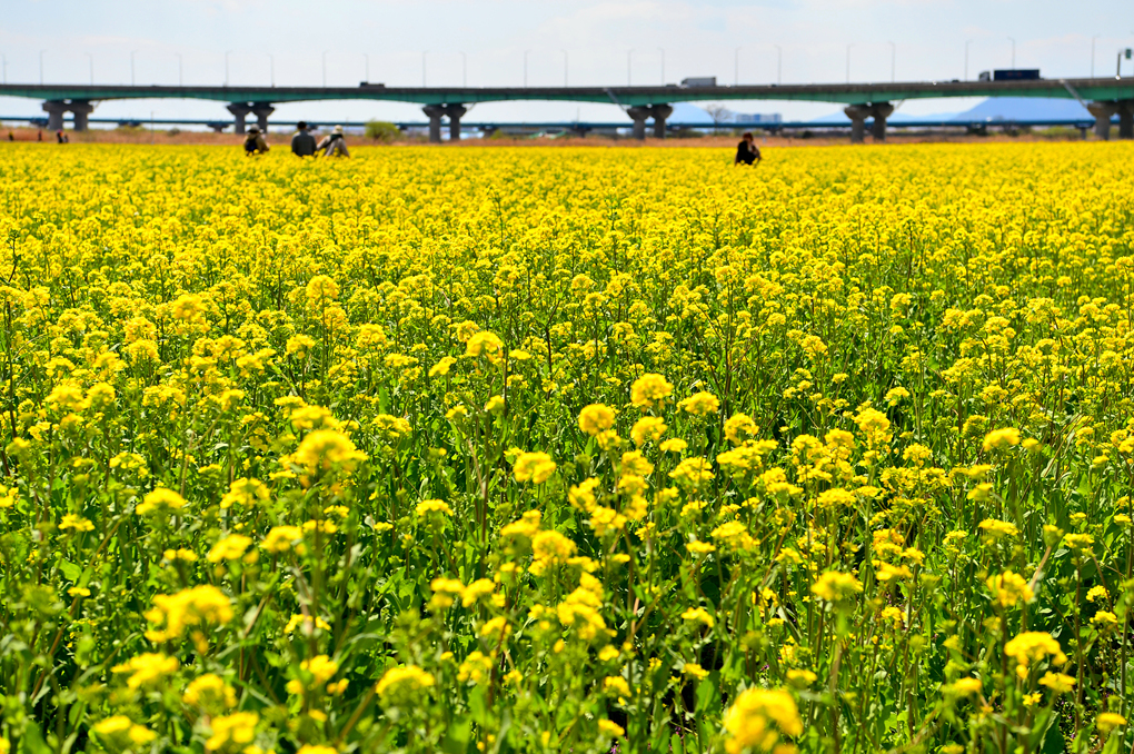 유채꽃밭 너머의 뚝방길에는 벚꽃이 피어 있나 보다.