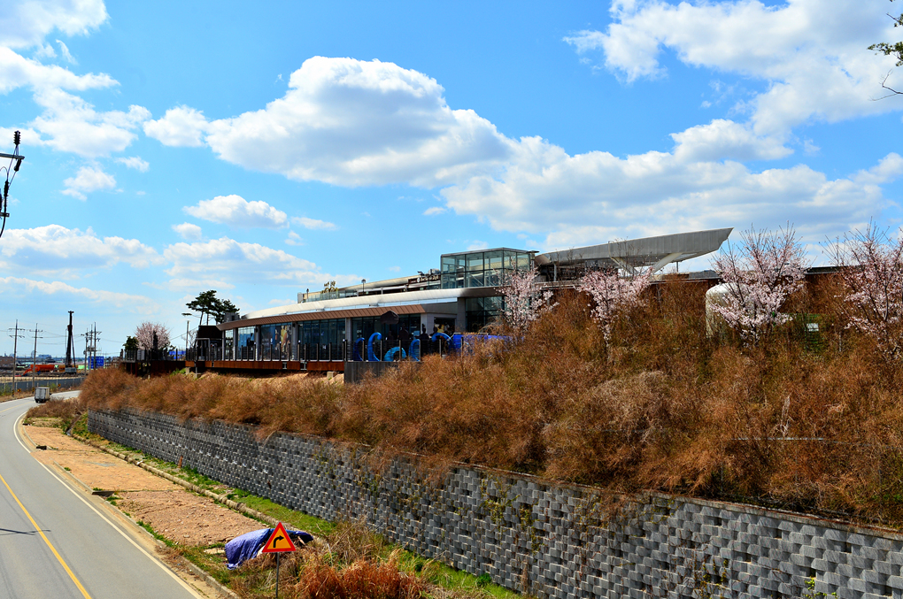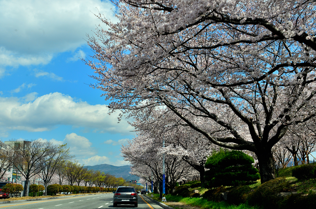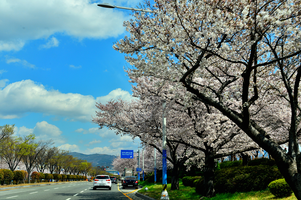 휴게소를 나서서 도착한 곳은 부산의 대저생태공원인데, 대로변의 활짝 핀 벚꽃이 아름다운 경관을 보여준다.