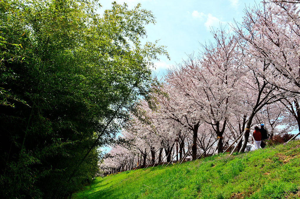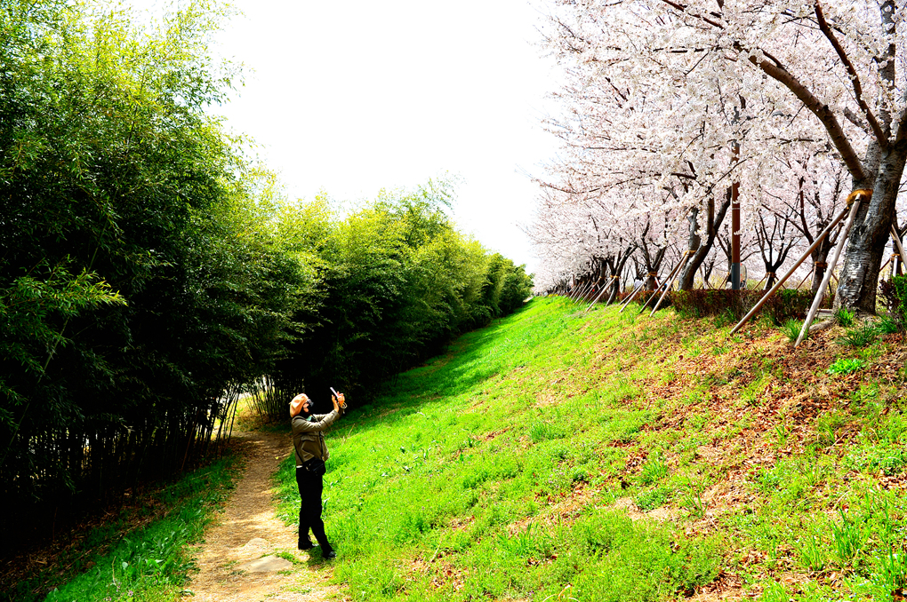 둑길 위에는 벚꽃이 활짝 피어 있다.
