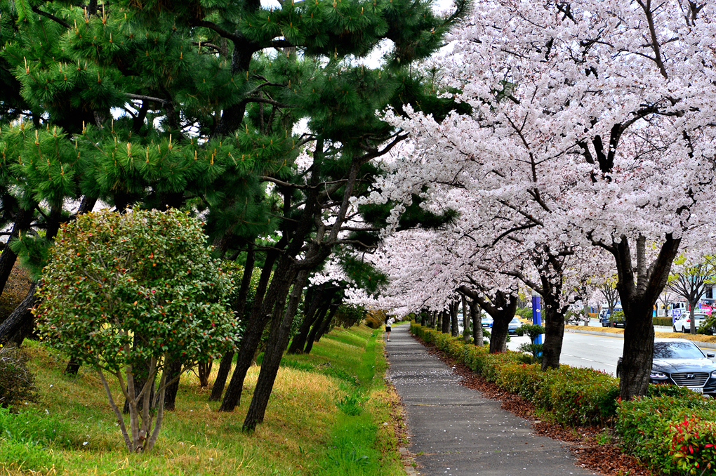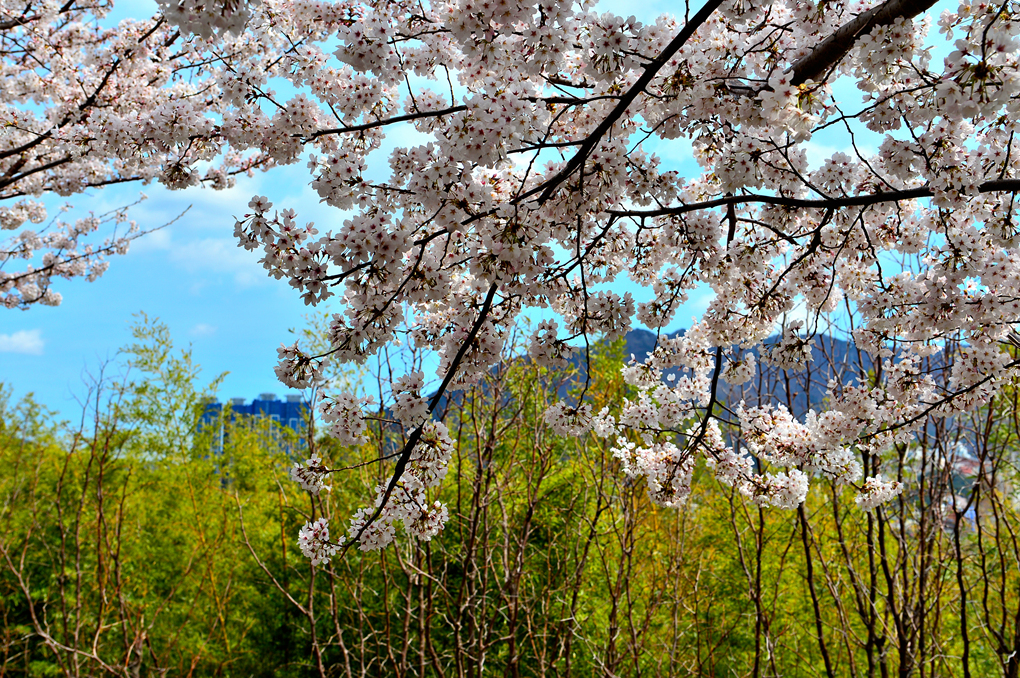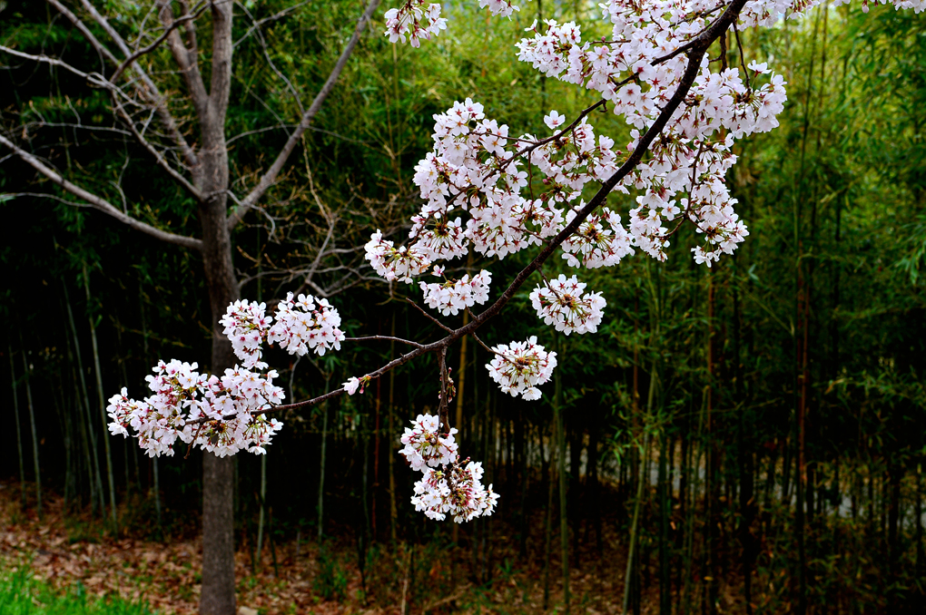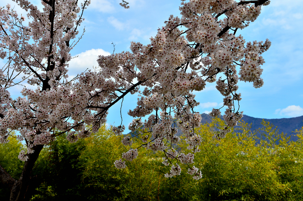 푸른 대나무와 어우러진 활짝 핀 벚꽃이 아름답기만 하다.