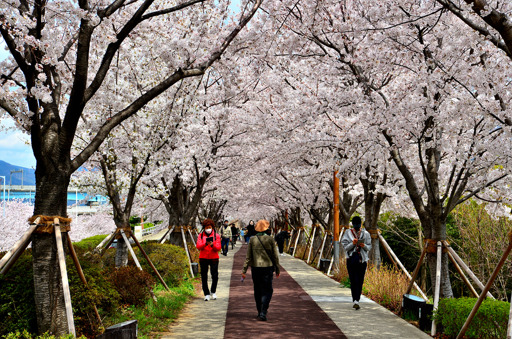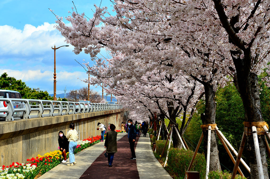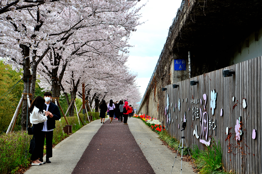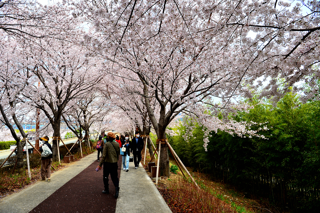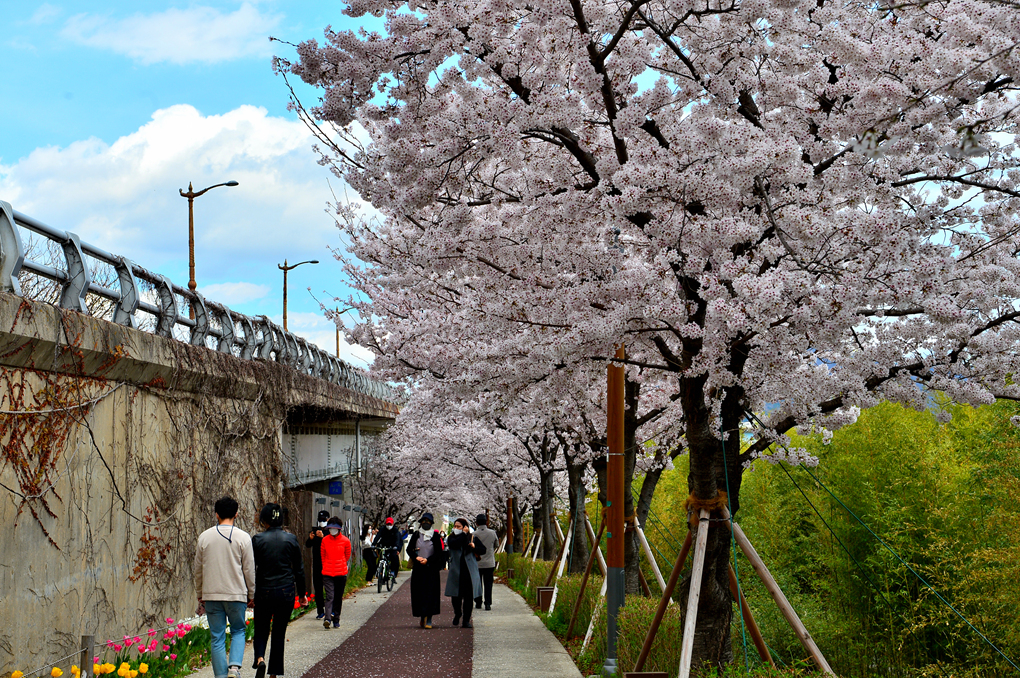벚꽃이 만발한 둑길로 연실 찾아드는 상춘객들 모습이다.