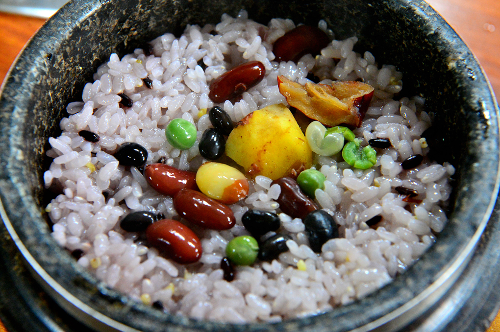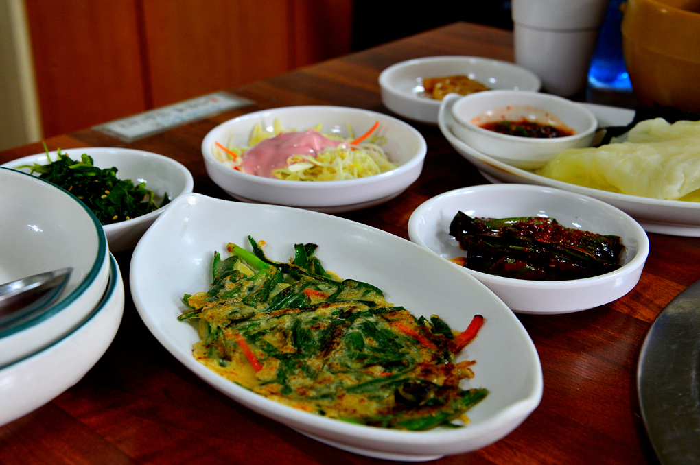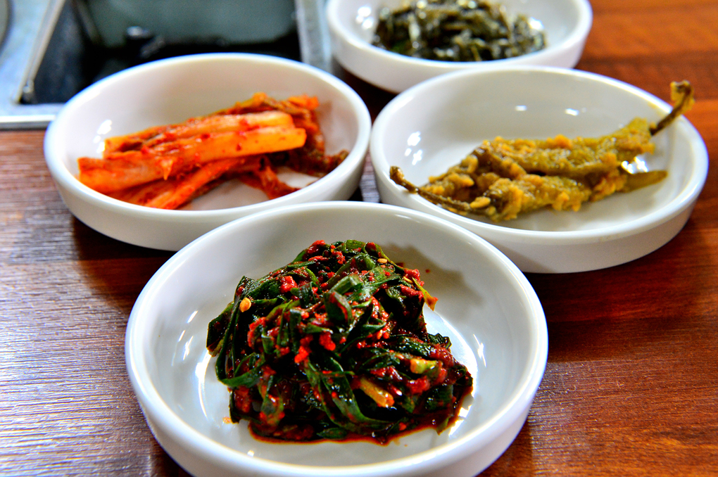몇 가지 제공된 반찬들이 정갈하고 맛있어 보인다.