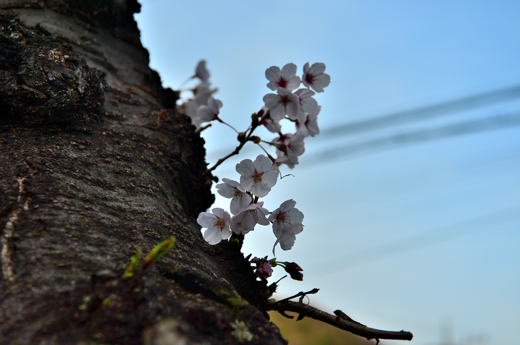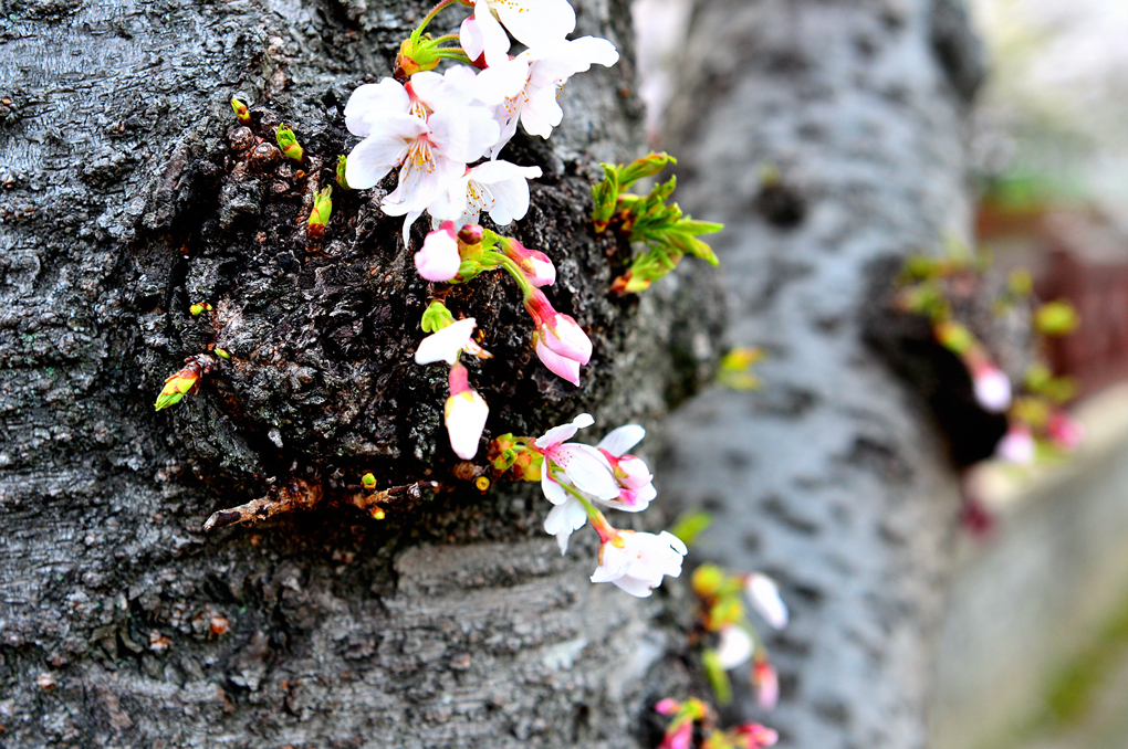 고목의 등걸에서 자라나는 앙증맞은 작은 벚꽃이 아름답게 다가온다.