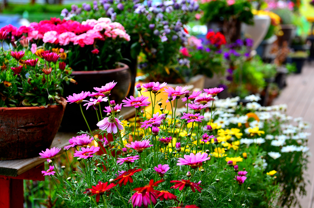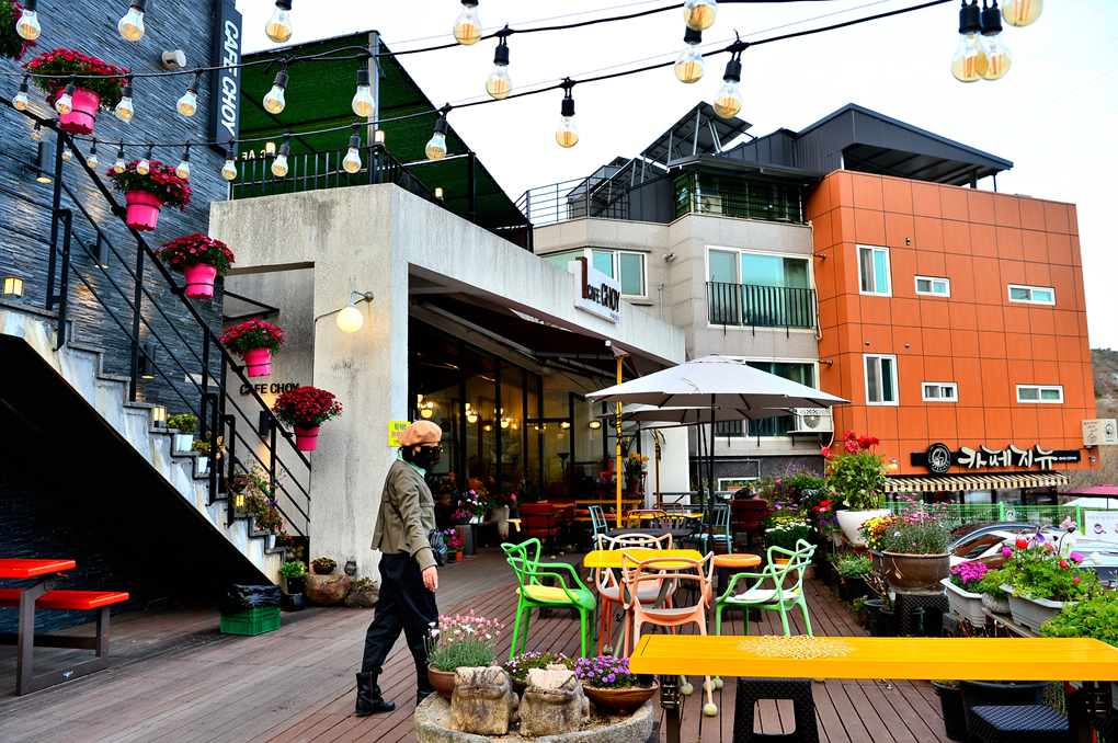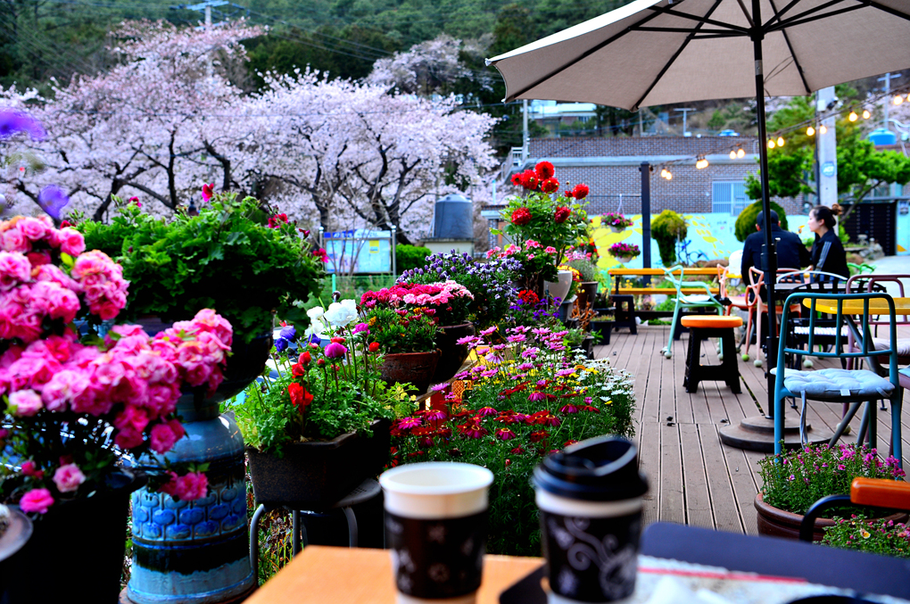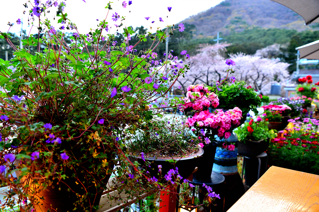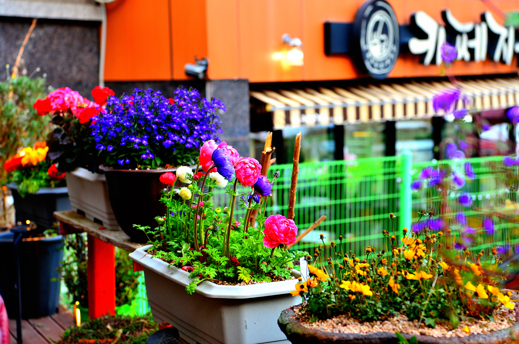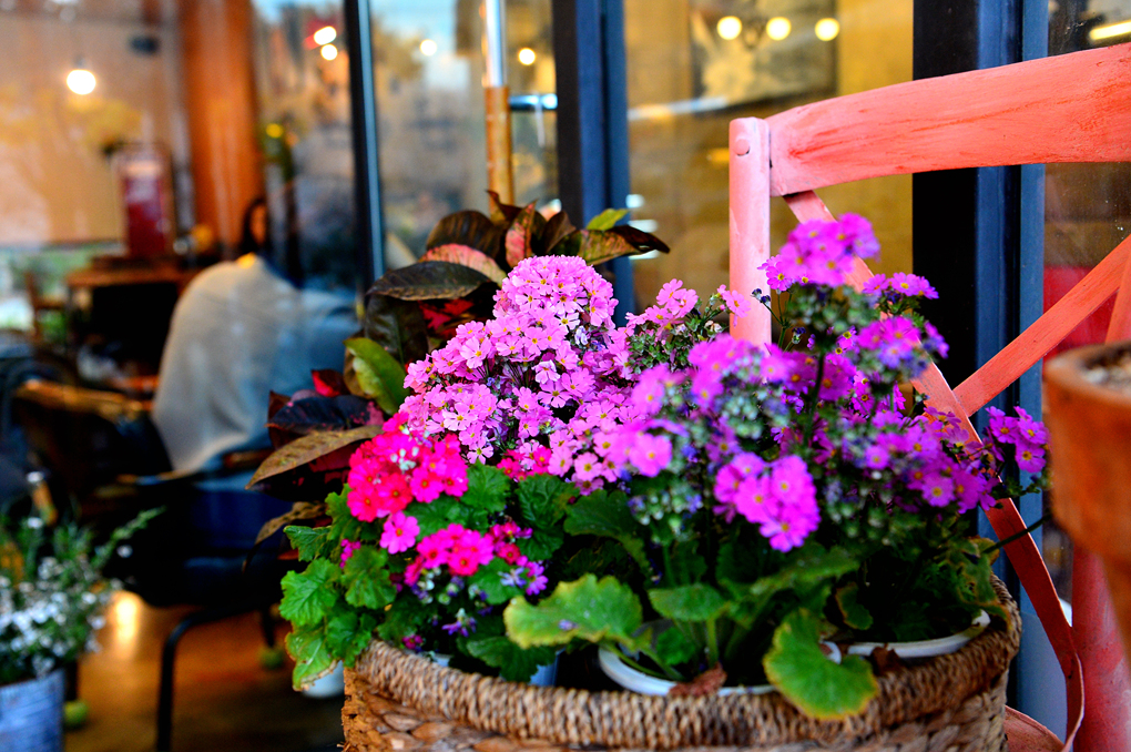 카페 외부의 아름다운 꽃들이 카메라를 유혹한다.