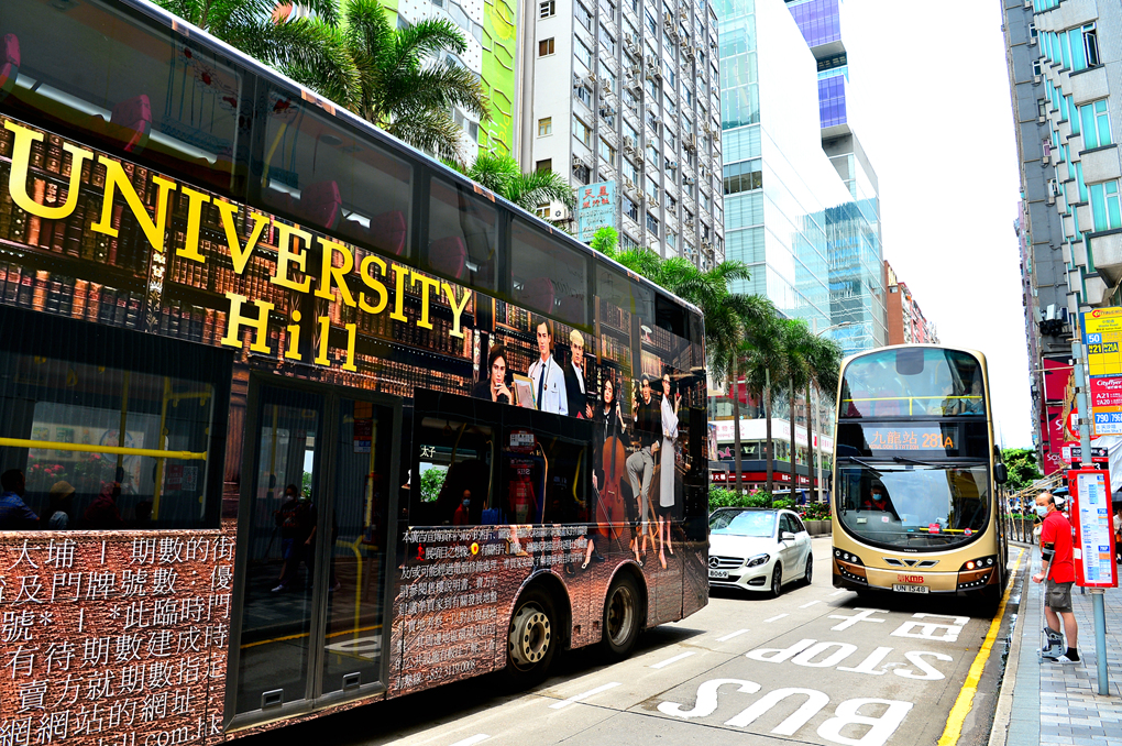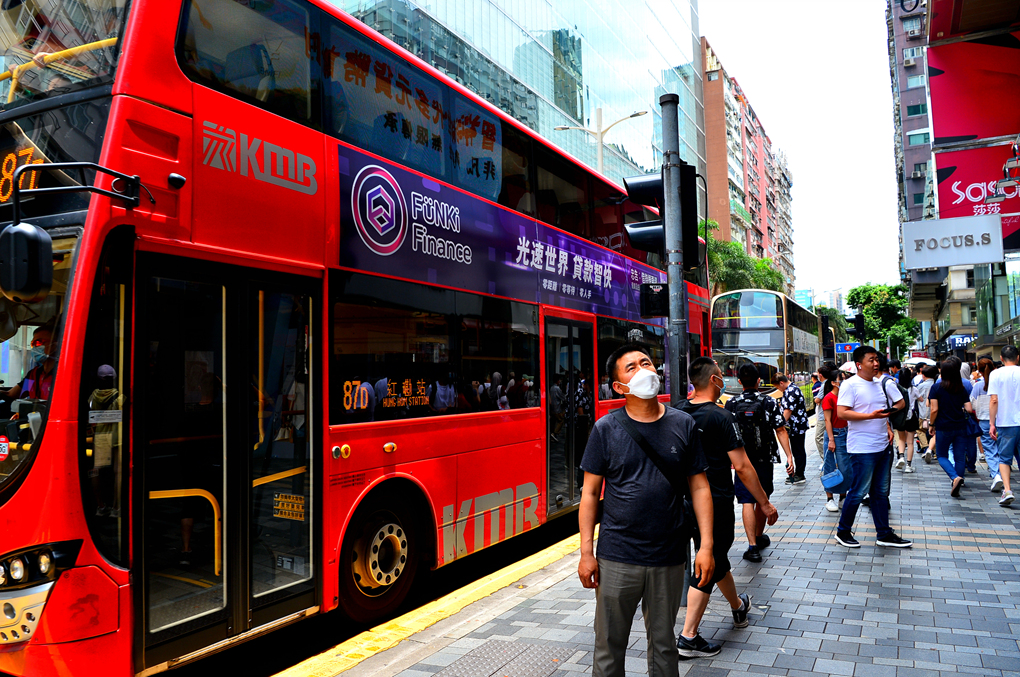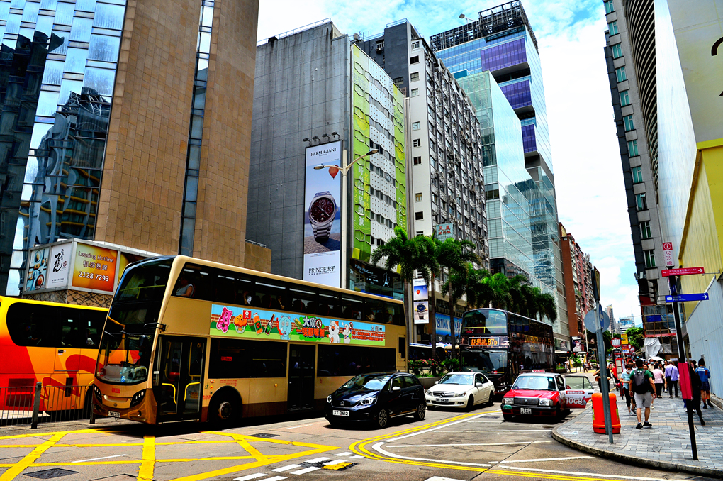 도로를 가득 채우고 달려오는 홍콩의 명물 2층 버스와 많은 인파가 거리를 가득 메우고 있다.