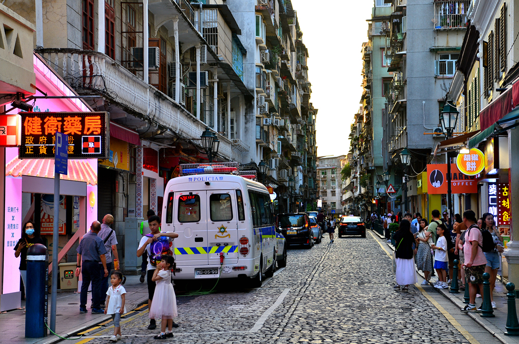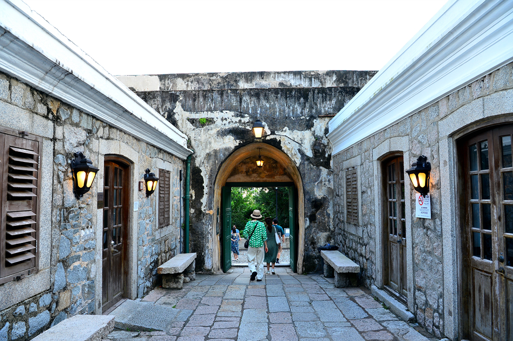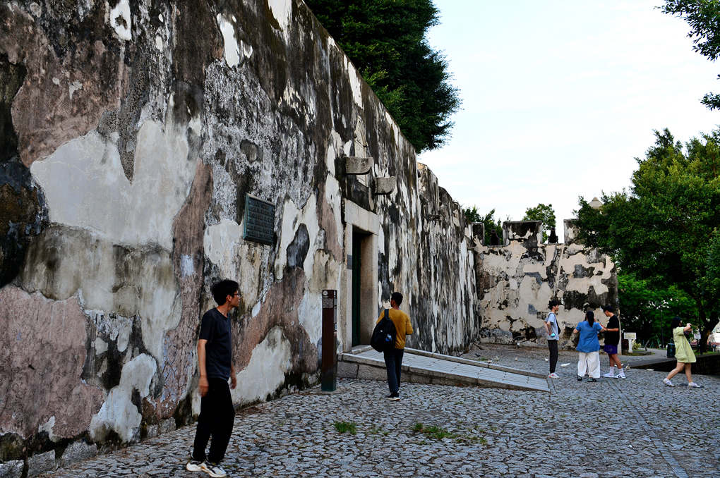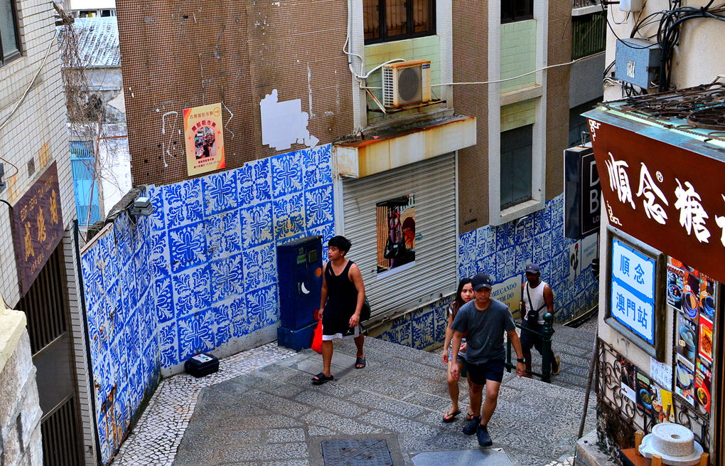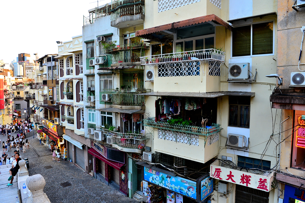 성 바울 성당 유적이 빼꼼히 고개를 내밀고 있고 양 옆으로 파스텔톤 건물들이 늘어서 있는 한적한 골목이 무척