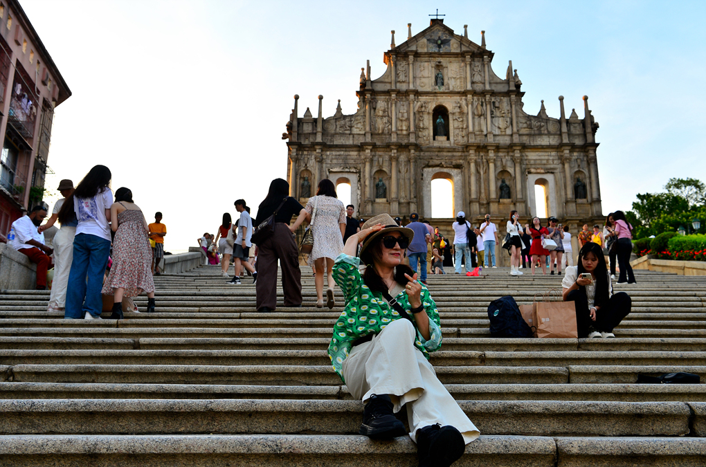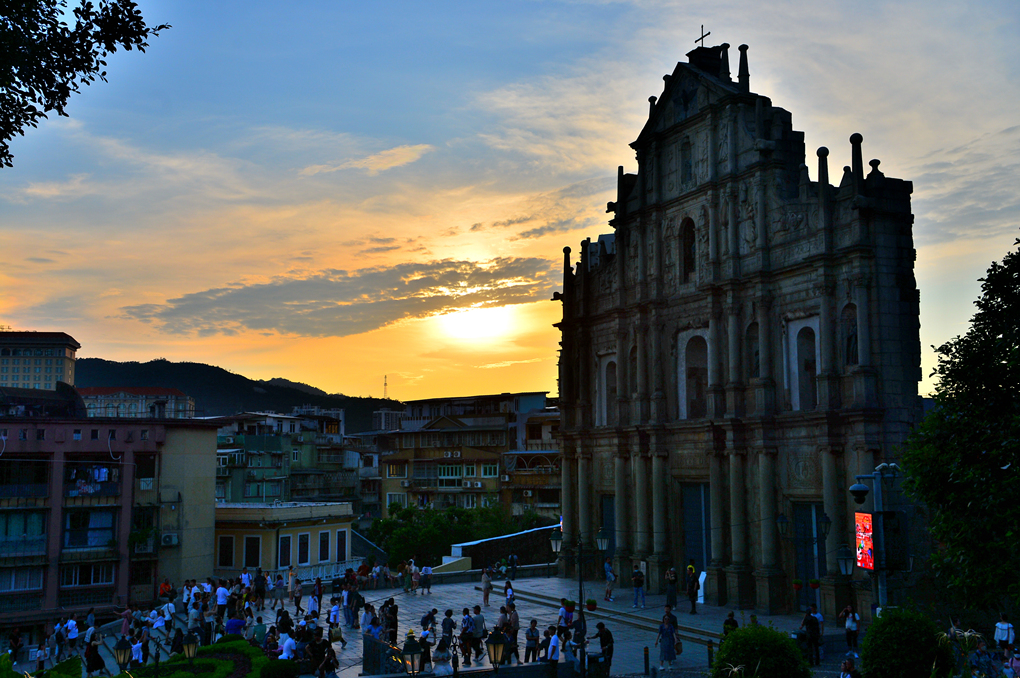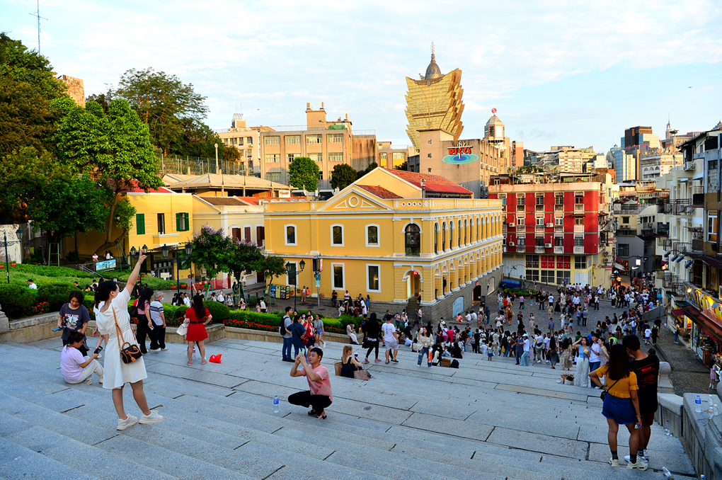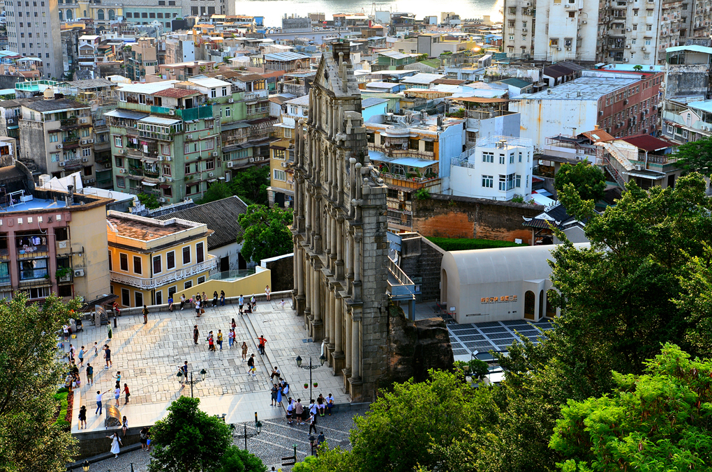 성당 유적 앞에서 본 광장과 그 너머의 마카오 시가지 풍경이다.