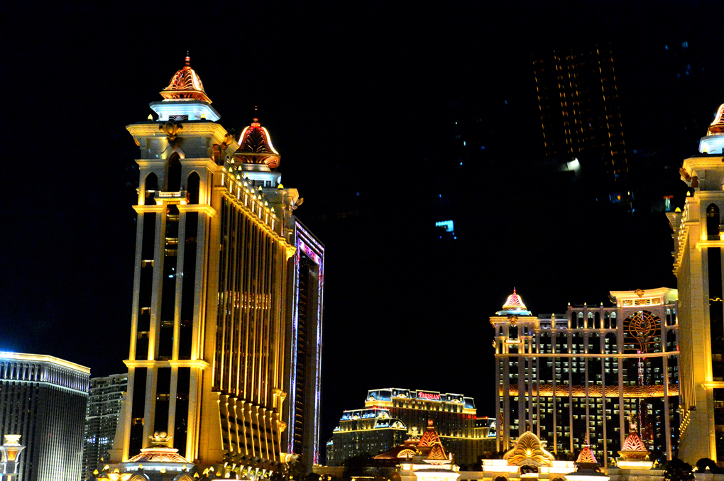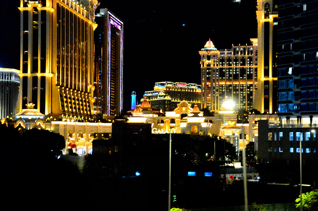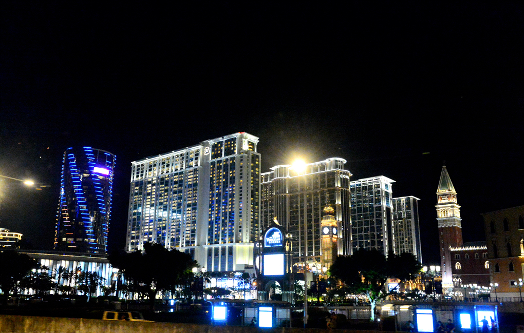 마카오 반도의 관광 중심지답게 화려한 거리에 각종 차량과 인파가 넘쳐 난다.