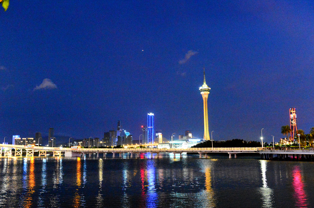 호수 너머로 보이는 마카오 타워와 다리 모습이다.