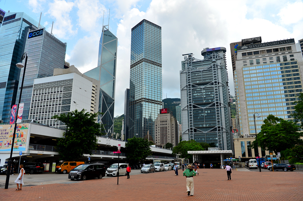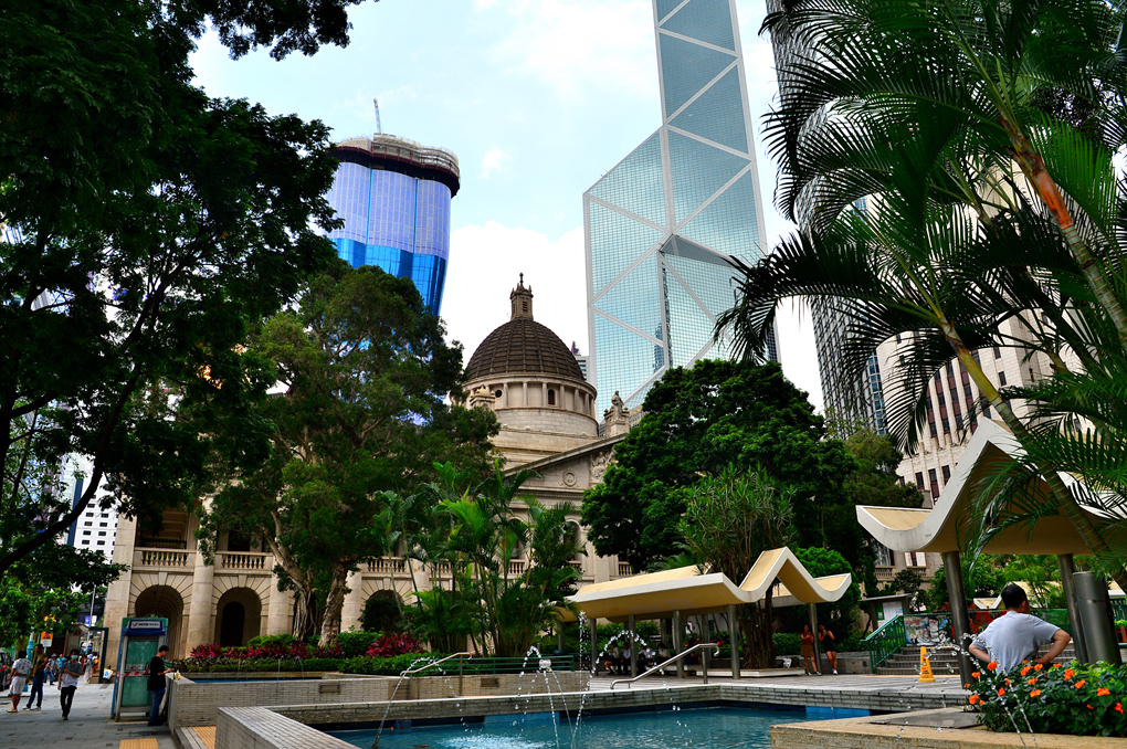 광장 한쪽면에 위치한 이 높은 빌딩은 홍콩 화폐에도 등장하는 홍콩 상하이 은행 HSBC 홍콩 본점으로, 홍콩 화폐를