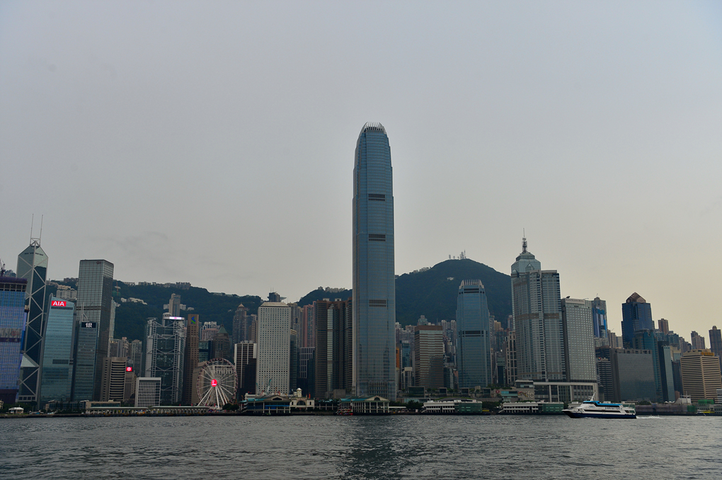 오른쪽으로 장난감처럼 작게 홍콩 대관람차 모습이 보이고, 그 옆에는 홍콩 넘버 2 고층 빌딩 IFC가 늠름한 자태로