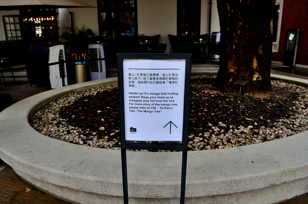 머리 위로 망고가 떨어질지도 모르니 조심하라는 안내판이 세워져 있다.