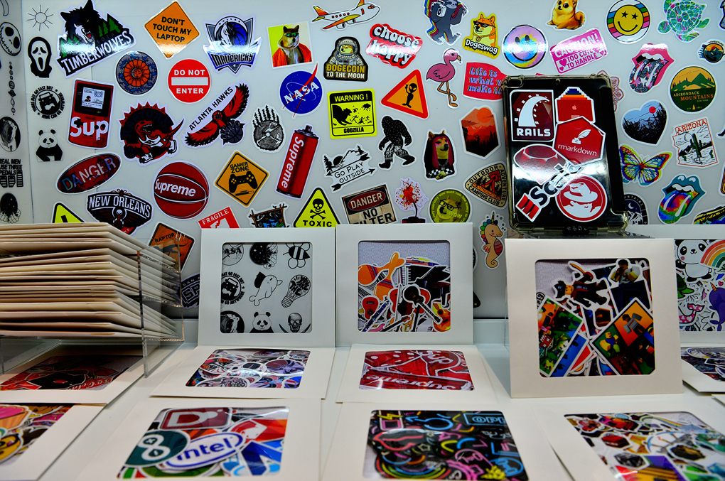 실의 출구 쪽에 마련되어 있는 각종 스티커들 모습이다.