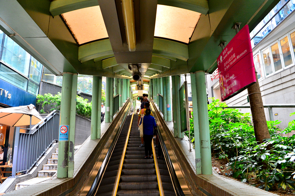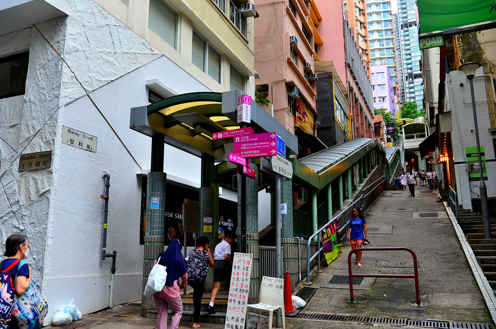 미드레벨 에스컬레이터는 단일한 통로가 아니라 20개의 에스컬레이터가 연결되어 있는 것이라서 그 출입구를