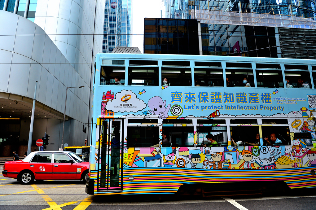지적재산권을 보호하자는 문구를 단 트램을 장식한 그림들이 재미있게 다가온다.