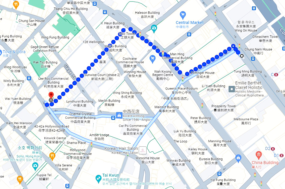 할리우드 로드의 식당에서 이곳까지 걸어온 우리의 발자취다.