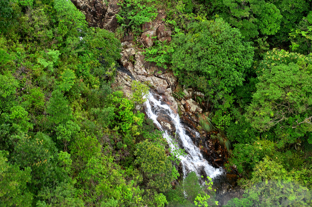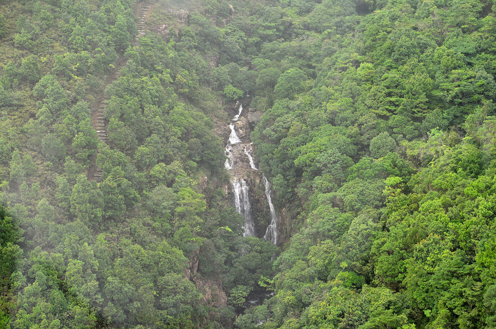 케이블카 아래로는 가파른 산세를 타고 흐르는 가느다란 폭포 줄기가 보인다.