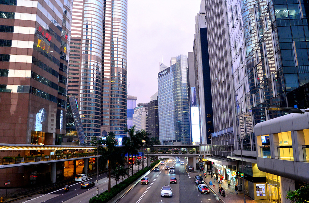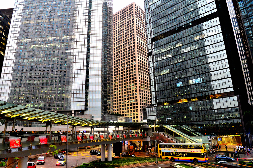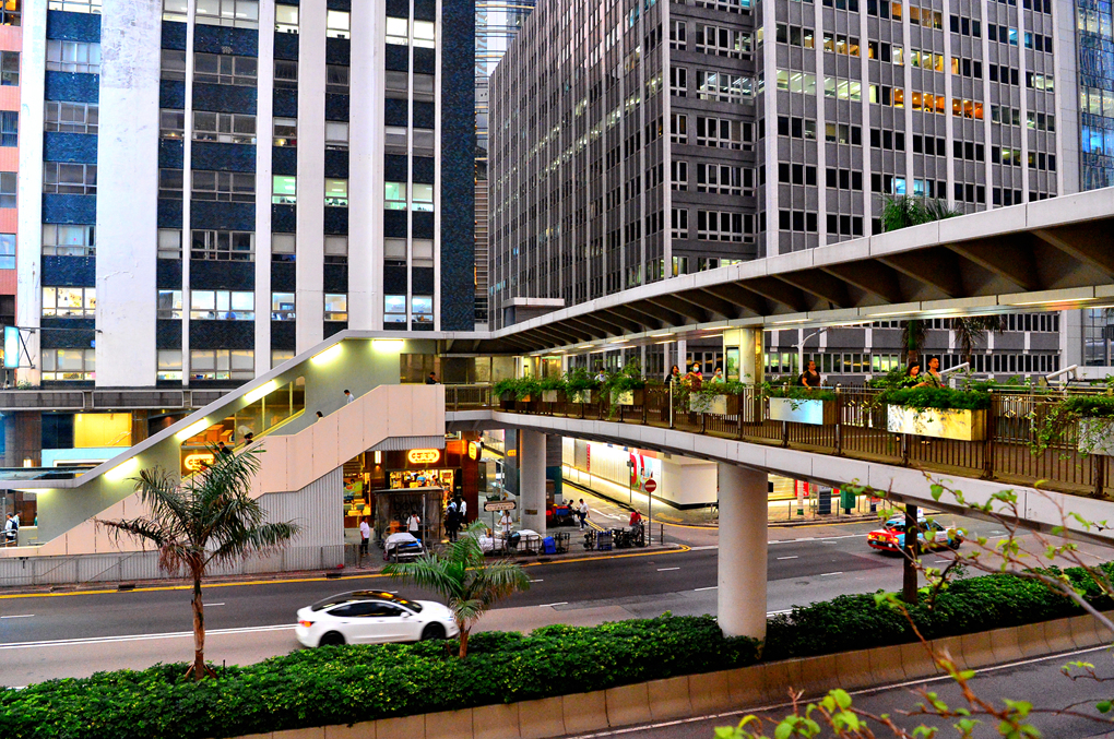 도로를 가로지르는 센트럴 스카이워크 Central Sky Walk와 주변의 고층빌딩들 모습이다.