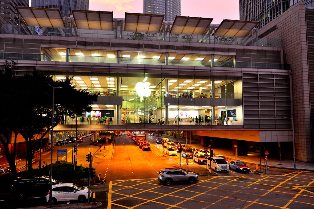 IFC 몰의 애플 매장과 그 건너편으로는 센트럴의 고층 빌딩들이 줄지어 늘어서 있다.