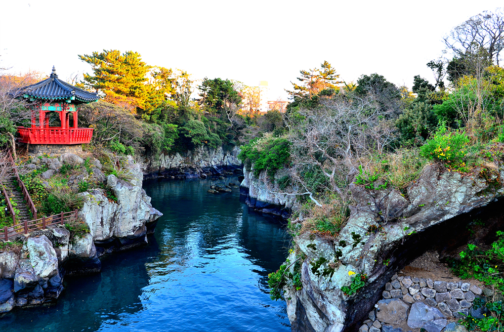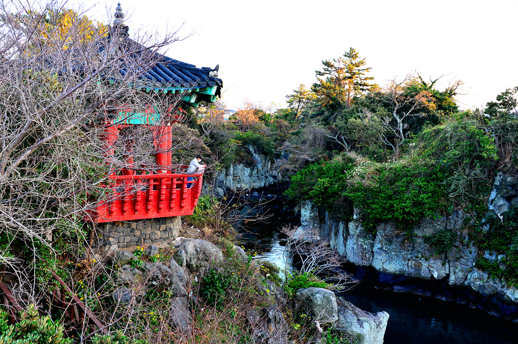 좁은 계곡과 그 옆의 붉은색 정자가 아름다운 풍경을 연출하고 있다.
