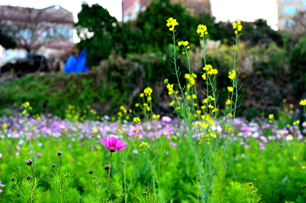 코스모스 꽃밭 주변에는 유채꽃도 피어 있다.