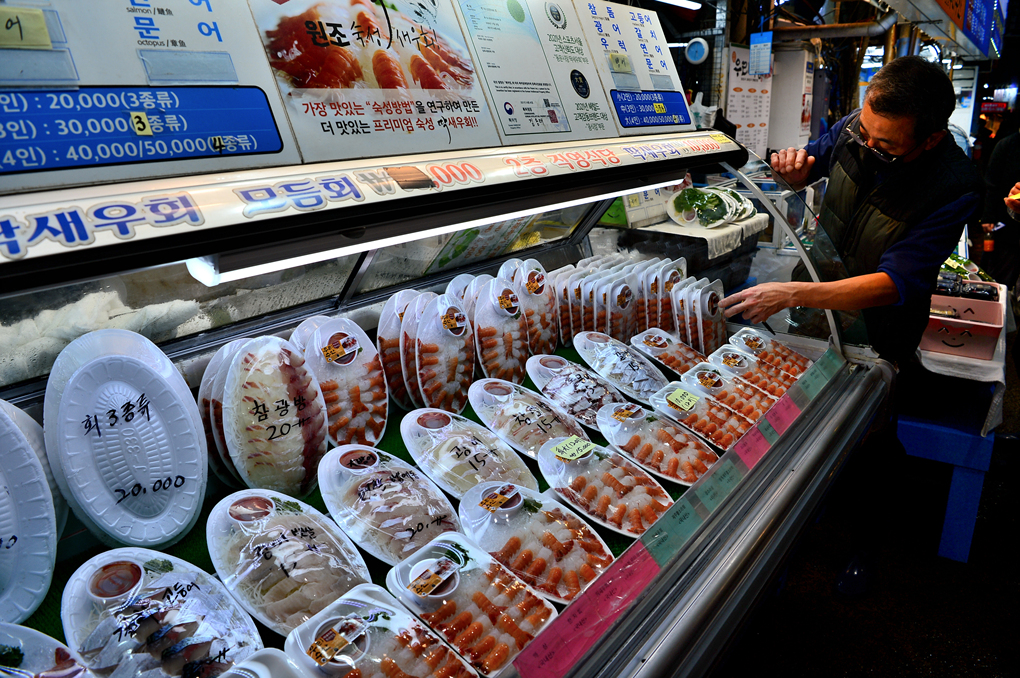 각종 회들을 정갈한 모습으로 매대에 늘어놓은 모습도 보이고~