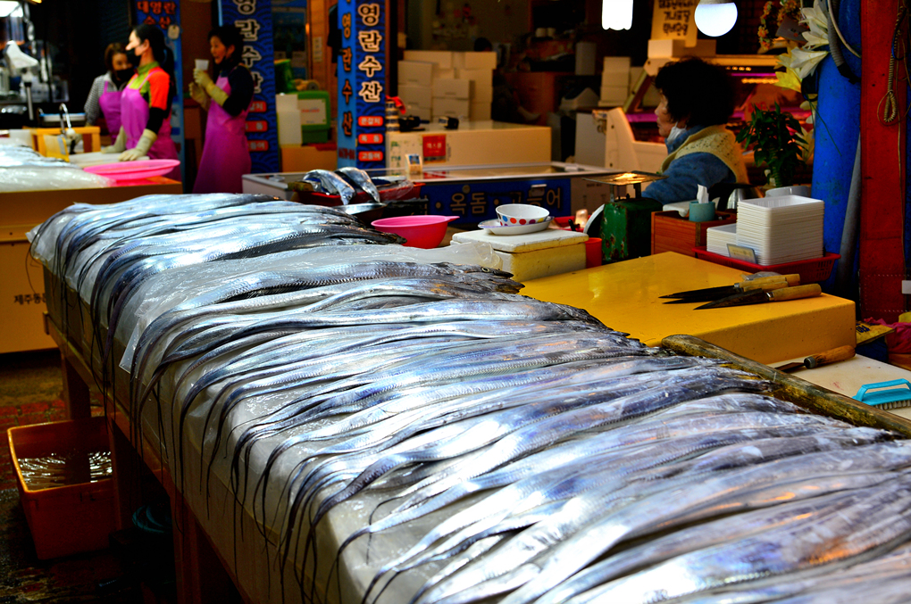 매대 위에 줄줄이 길게 늘어선 하얀 은갈치~
