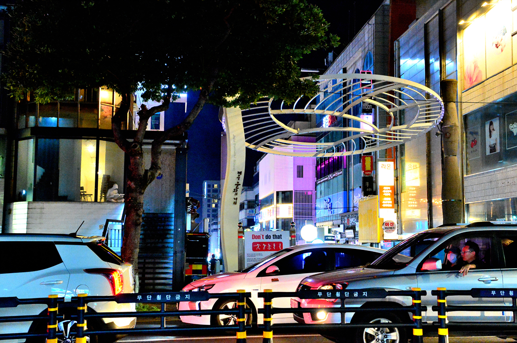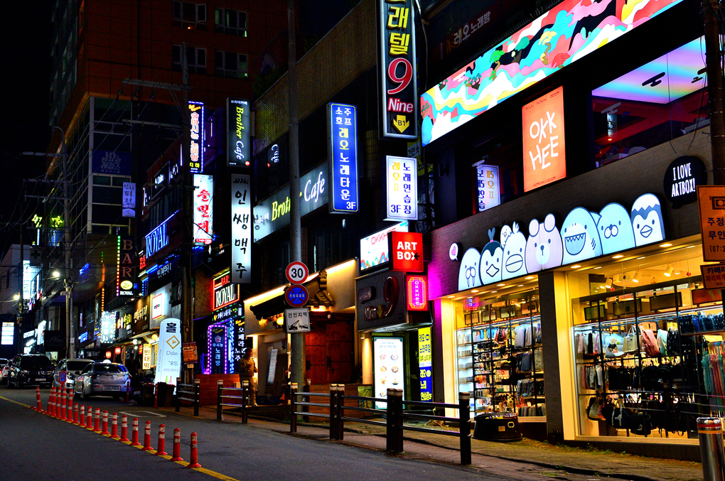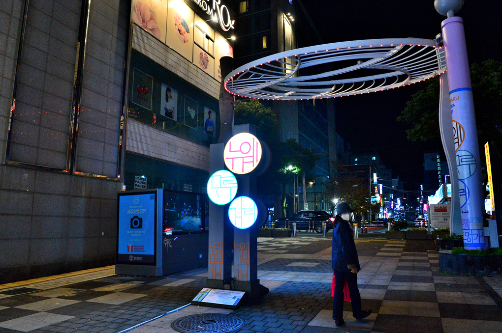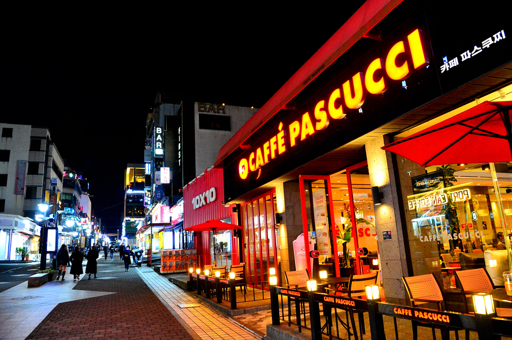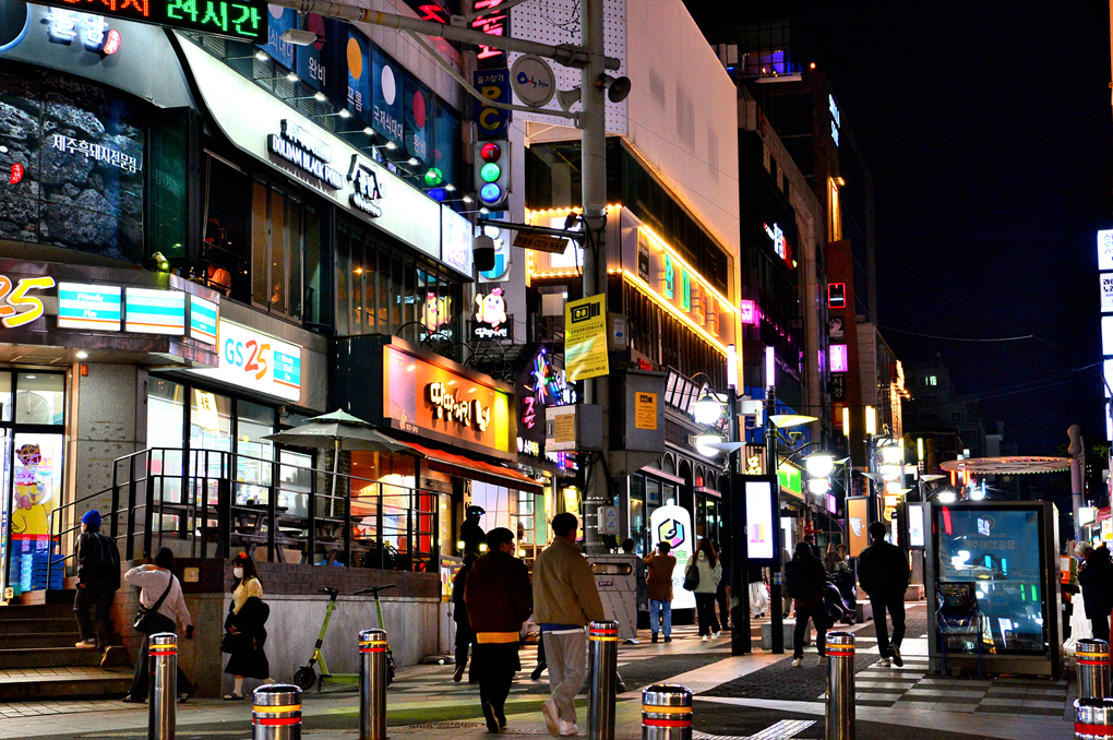 우리가 체크인한 호텔 정면으로 제주 문화의 거리라는 누웨마루 거리 표지판이 세워져 있다.