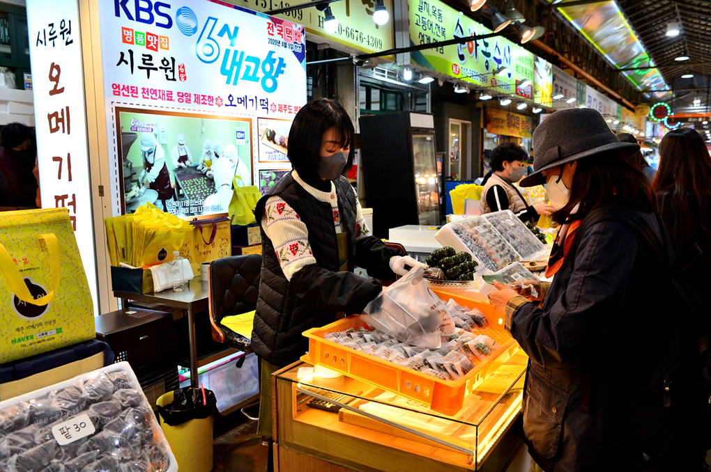 제주에서는 꼭 오메기떡을 맛봐야 한다며 발걸음을 멈추신다.