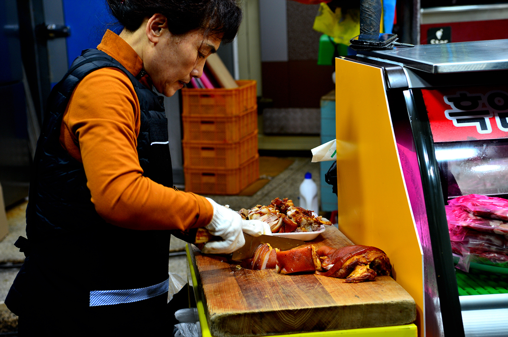 전통방식의 족발을 썰고 계시는 아주머니의 손길이 바쁘기만 하다.