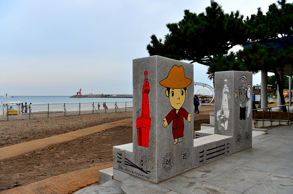 해변에서 제일 먼저 반겨주는 빨간색, 하얀색 등대와 어리, 해리라는 이름의 원주민? 모습이다.